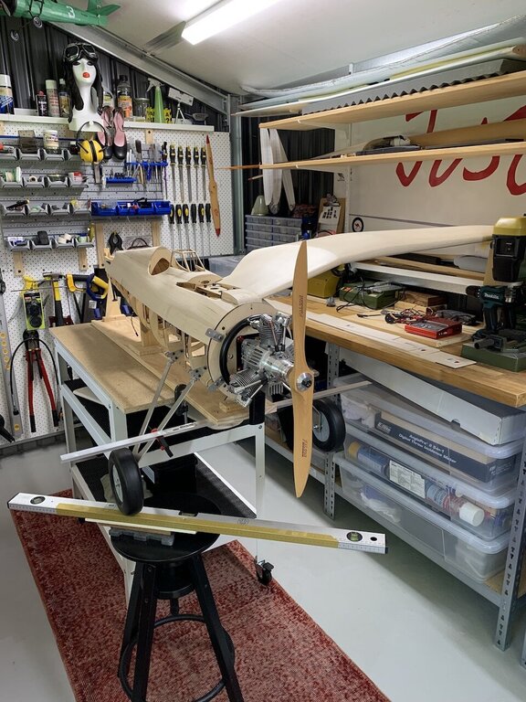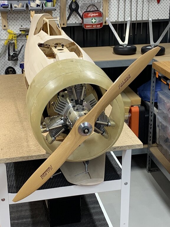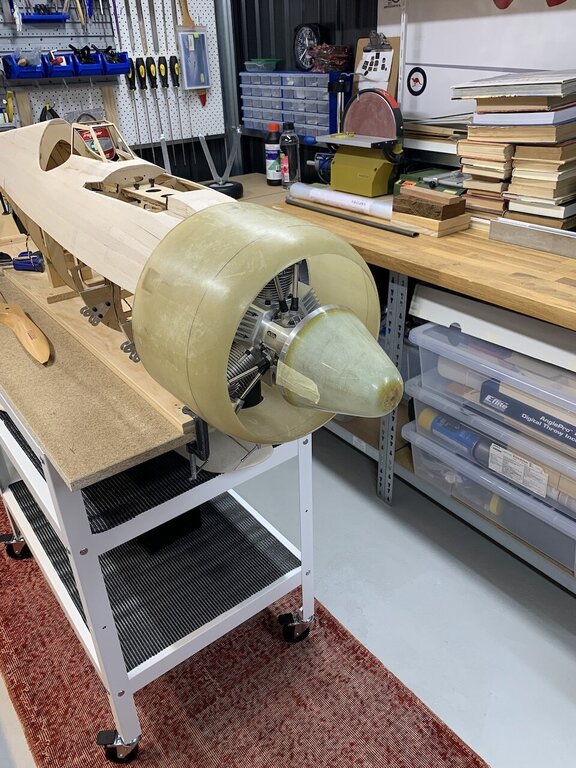 Witam, Dzisiaj sprawdziłem odstęp śmigła od ziemi w locie poziomym. Wyszło 90 mm. Rozstaw kół podwozia zgadza się z planami.Zrobilem to szczelinę w osłonie silnika. Zlozylem wszystko razem. 11nastaka nabiera kształtu. -