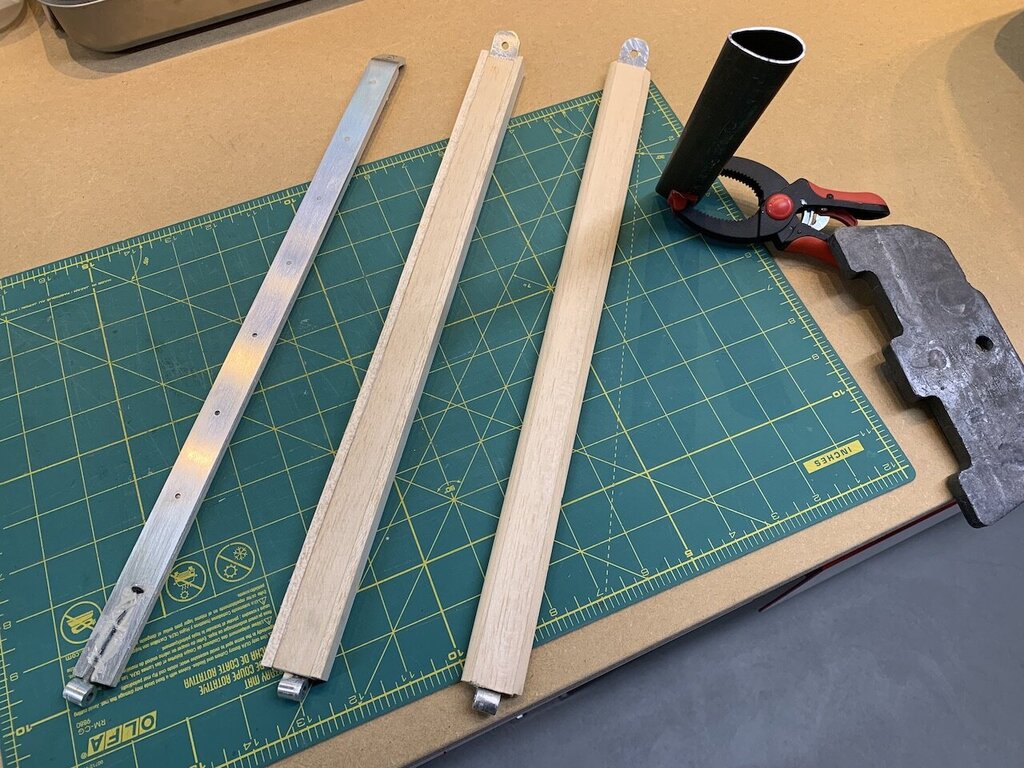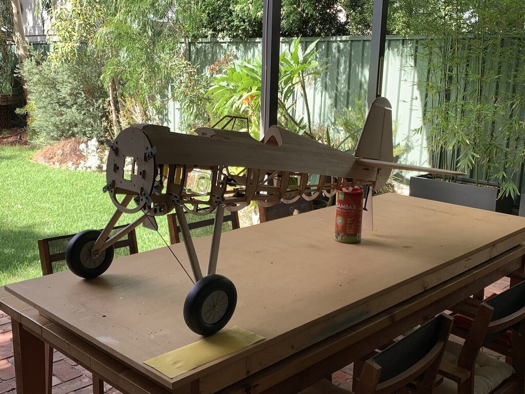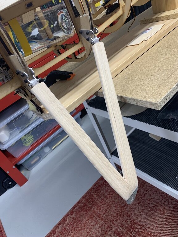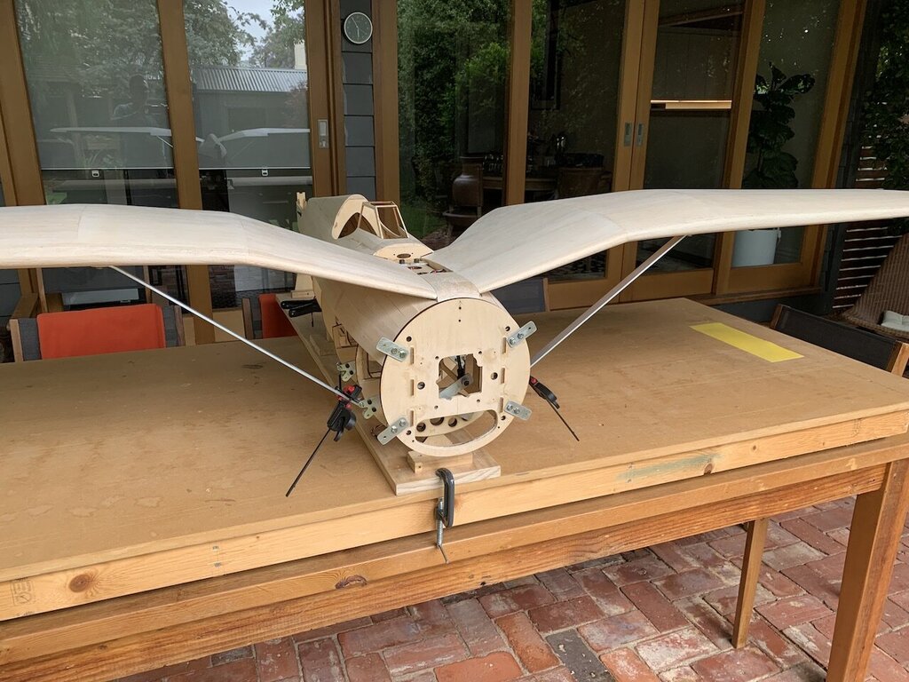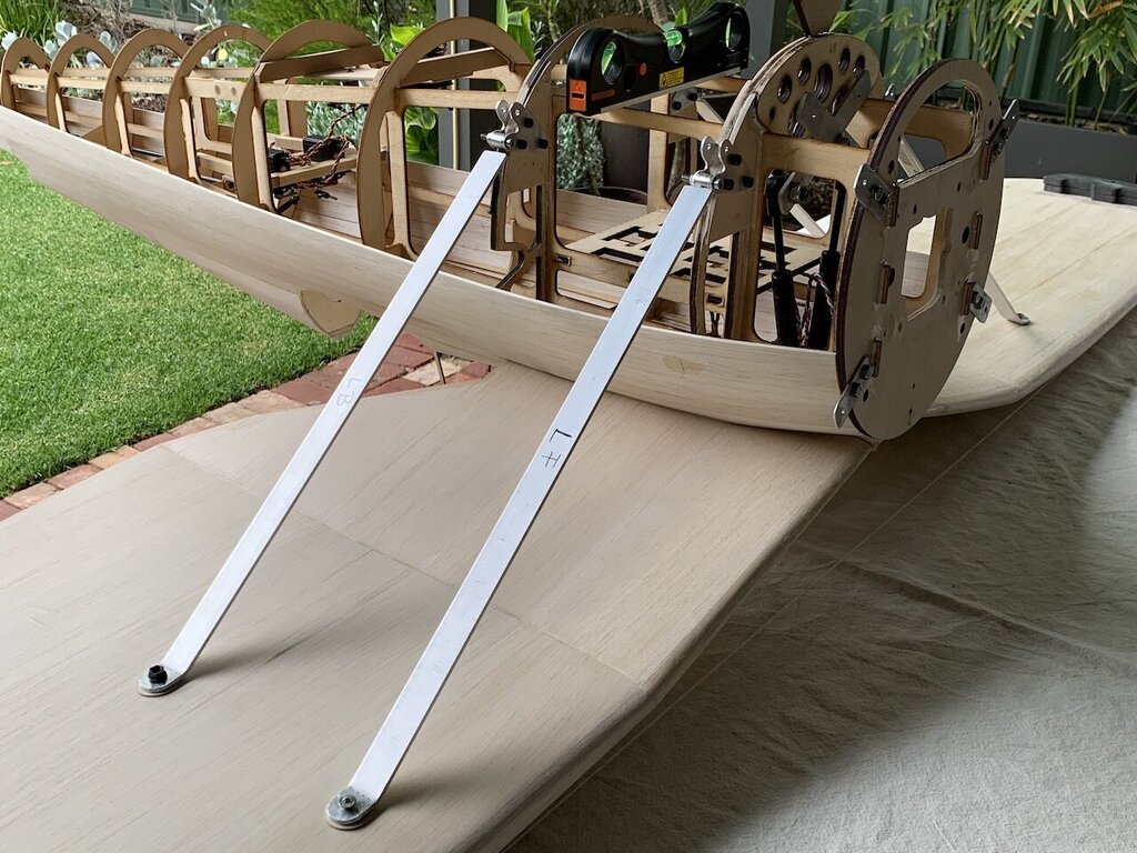 Witam, Przesylam trochę ciepła ze słonecznej Australji i życzę Zdrowych Świat. Skończyłem pierwszy zastrzał. Wazy 89 gramów.Oklejony jest balsa. Przekrój jest takin jak ta część z prawdziwego samolotu. Zdjęcie tych zastrzałów w różnych etapach budowy. -