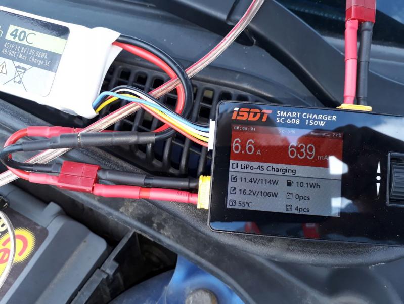 I tak na podsumowanie tematu i rozwianiu moich wątpliwości, zakupiłem w/w ładowarkę i sprawdziłem, jakim prądem możemy ładować pakiety 4S na lotnisku z akumulatora samochodowego Pb12V. Zakres napięć zasilania producent podał od 9 do 32V. Przy zasilaniu 11,4V możemy wydusić z ładowarki 6,5 - 6,6A. Do 8A troszeczkę brakuje... Przypuszczam że, dla pakietów 5S i 6S prąd będzie odpowiednio niższy...