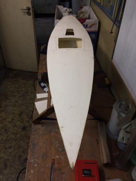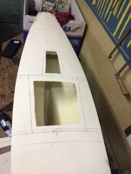 Cześć, Dzisiaj spędziłem trochę czasu nad planami i pomiarami kadłuba. Uściśliłem skalę do 1:7,6 i wyznaczyłem miejsce głównej nadbudówki. Wyciąłem też frezem dwa główne otwory w laminatowym kadłubie. Pozdrawiam, Łukasz -
