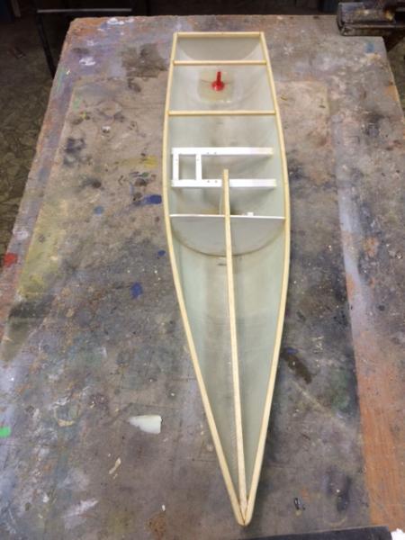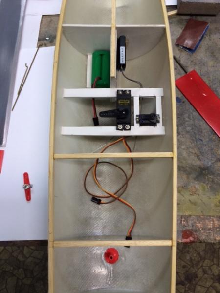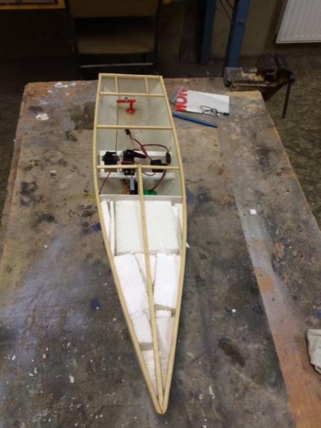Cześć, Dziękuję za rady i zainteresowanie. To już ostatni post nie w czasie rzeczywistym budowy. Do tej pory sprawdziliśmy działanie pakietu wraz z serwami i jest O.K. Wszystko działa:). Następnie zostały wklejone wzmocnienia z listewek i wycięty pokład. Skrzynka mieczowa dostała dwie poprzeczki z listewek, których zadaniem ma być też usztywnienie pokładu. Wklejone na żywicę części są odpowiednio sztywne, więc nie będzie już nic wzmacniane. Pozdrawiam, Łukasz -