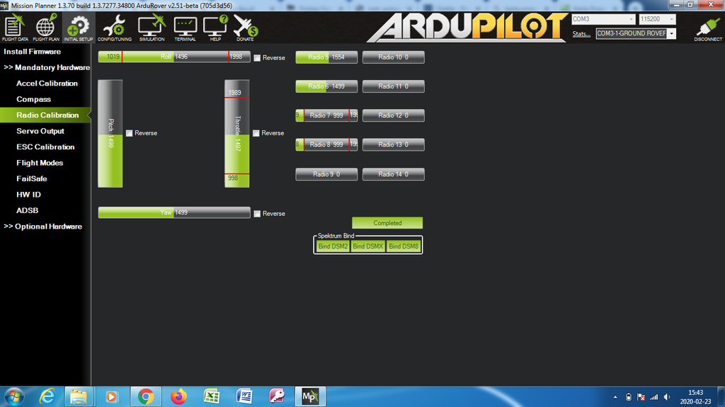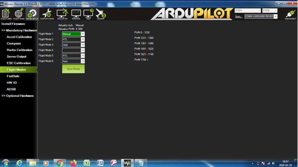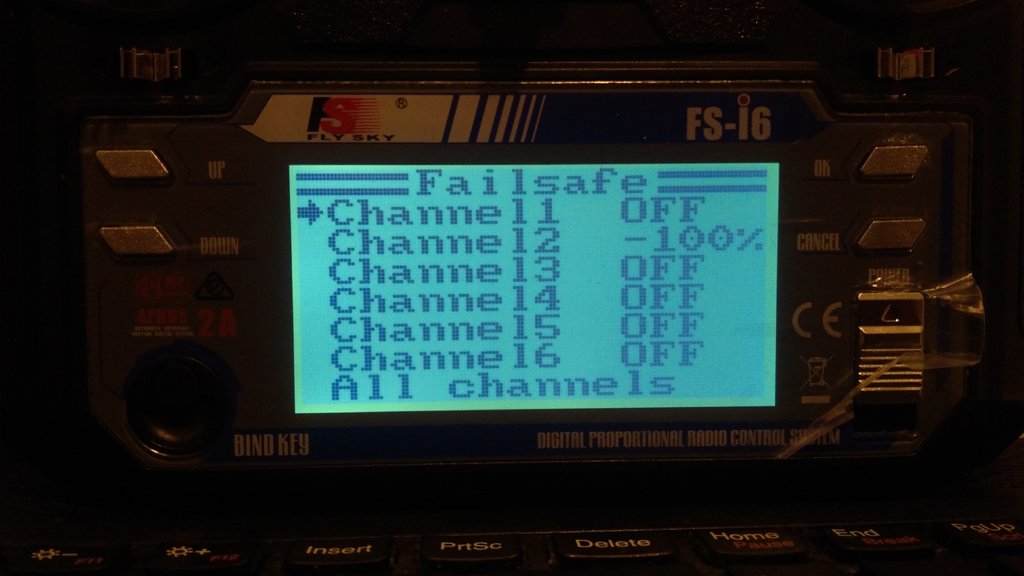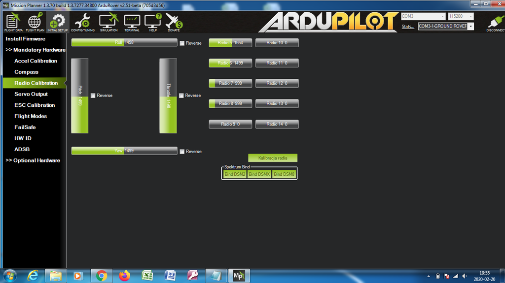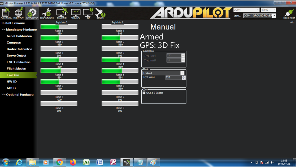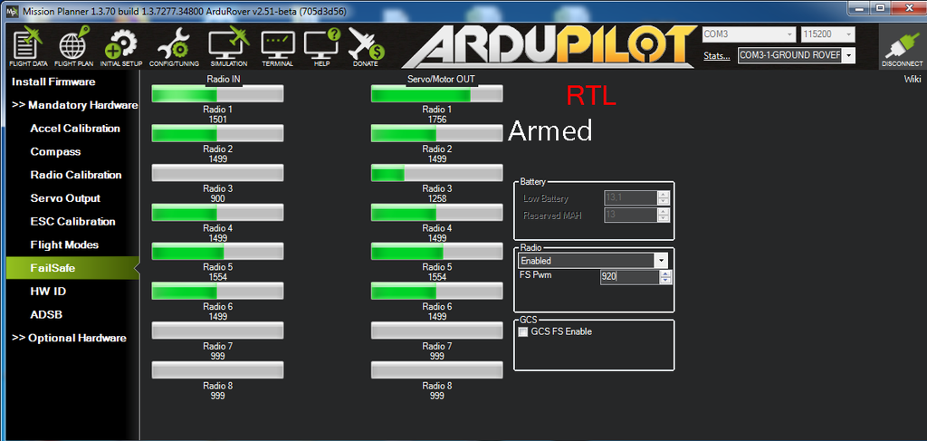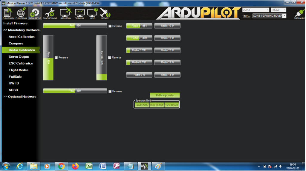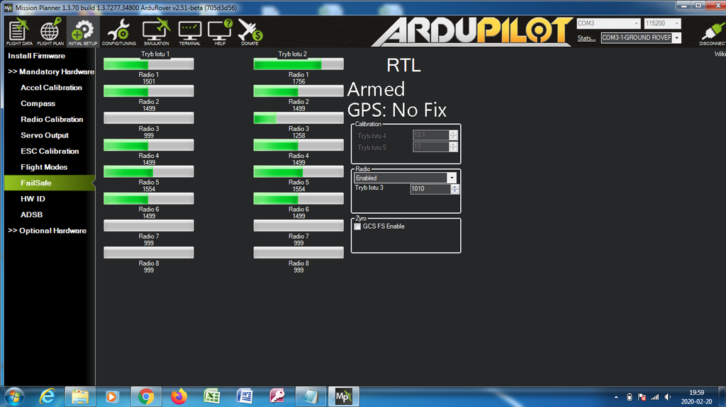 Ok w fail safe zmieniłem na -120% i teraz mam poniżej 999. RTL uruchamia się jednak po właczeniu aparatury nadal działa ODBIORNIK ch1->input 1 APM-->outputs 1->regulator->silnik ch2->input 3 APM-->outputs 3->regulator->silnik ch7->input 7 APM ch5->input 8 APM Odbiornik mam bezpośrednio podpięty kabelkami do APMa