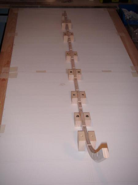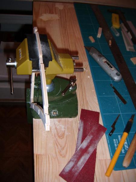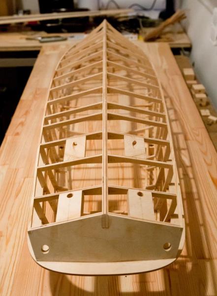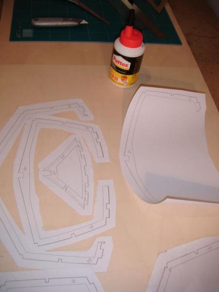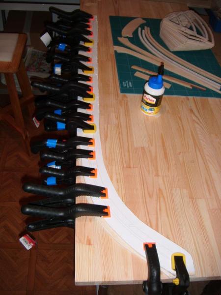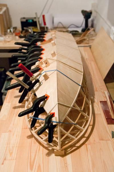 W sumie chodzi mi o to, żeby się moja łódka nie rozkleiła w wodzie, a że model nie będzie wyczynowy, więc na razie zostanę przy Distalu, którego mam jeszcze kilka opakowań. Tymczasem zacząłem oklejać szkielet kadłuba: -