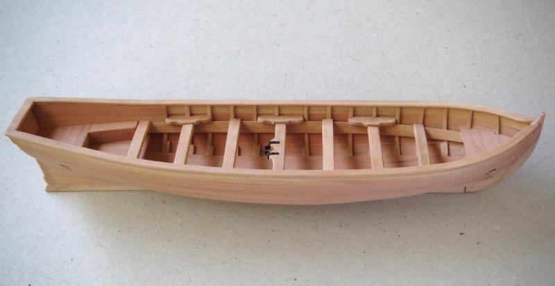 Gdybym miał Twoje umiejętności i park maszynowy, których nie mam, to pewnie zrobiłbym sobie takie przekładnie. Myślę, że póki co temat własnej konstrukcji przekładni mnie przerasta. Dlatego skłaniałem się ku outrunnerom bezpośrednio napędzającym wały śrub, ale tu z kolei mam obawy w kwestii chłodzenia. Co do liczby obrotów śruby fi 55 mm - liczba 9600, którą podałem, to maksymalna podana przez producenta - domyślam się, że powyżej śruba wpada w kawitację. Póki co - nie mam pojęcia, jakie obroty powinny mieć te śruby, żeby ten model ładnie czyli rekreacyjnie ale efektownie pływał (zakładając, że będzie mu dane Zwodowany model Rivy, którego budowę podglądam, jest w skali 1:6 i waży 15 kg; napędzają go dwa inrunnery 3656, 1700 kV, zasilane z 3S LiPo 6150 mAh. Niestety nie wiem, jakie śruby go napędzają; napisałem niedawno do kolesia, który to zbudował, ale nie dostałem na razie odpowiedzi. Nie ukrywam, że kiedy czasem wezmę zimny prysznic, to sam podziwiam swój zapał Ponieważ w modelarstwie jestem zielony, a w kwestii napędów jeszcze bardziej, zapytam, czy 540-stki, o których wspominasz to silniki szczotkowe? Początkowo skłaniałem się ku szczotkowym, ale śruby (lewa-prawa) mają się kręcić w przeciwnych kierunkach, a gdzieś wyczytałem, że silniki szczotkowe muszą się kręcić w takim kierunku, dla jakiego zostały skonstruowane, czyli albo CW, albo CCW - w przeciwnym przypadku mają mniejszą moc, szybciej się zużywają i w ogóle katastrofa. Relacji ciąg dalszy (szkoda, że w realu tak szybko nie idzie) Elementy wymagające pozycjonowania kleję Distalem zwykłym, pozostałe Distalem Rapid. Obok szkieletu Rivy, jako ciekawostka, model (1:48) najmniejszej z trzech szalup fregaty Bonhomme Richard, zdłubany w tzw. międzyczasie. Poniżej większa fotka tej szalupki dlugości 15 cm (mam nadzieję, że nie zaśmiecam wątku). -