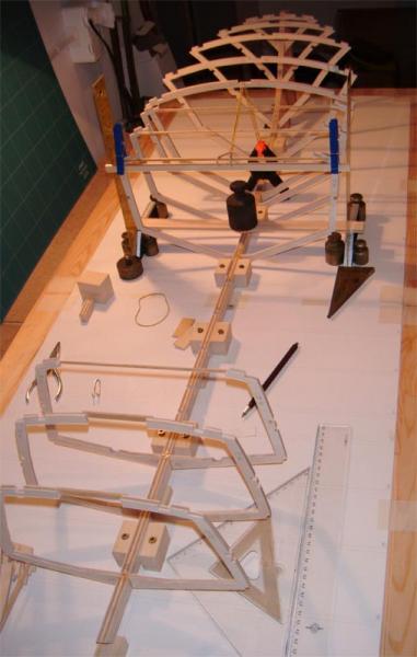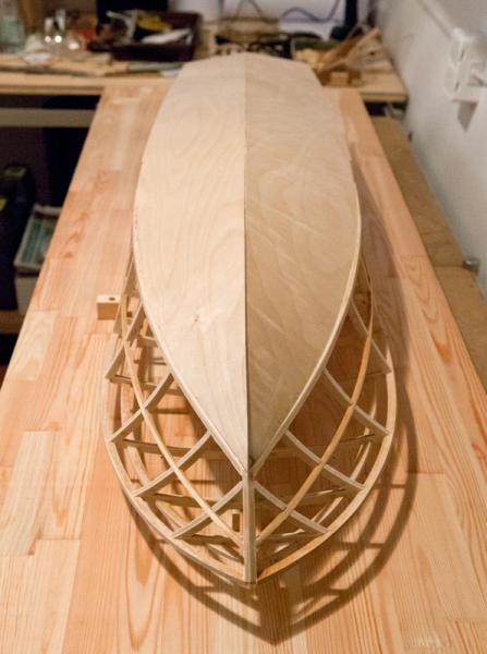 Dzięki za wszystkie sugestie i uwagi. W przypadku chłodzenia wodą planowałem pompkę i wyrzut przez imitacje rur wydechowych. W międzyczasie dowiedziałem się, że model z filmu powyżej napędzają plastikowe śruby Graupner 45 mm. Nie dowiedziałem się niestety, o jakim skoku; te które znalazłem w sieci, mają skok 24 mm. Gdyby trzymać się skali, śruby do tego modelu powinny mieć fi 60 mm i skok 72,5 mm, a mojego (i tu poprawka) - fi 50 mm i skok 62. To wszystko pod warunkiem, że prawidłowo rozszyfrowałem oznaczenie śrub napędzających oryginalną Aquaramę: 1”1/8-355x435 RH, 1”1/8-355x435 LH. A w stoczni najbardziej dotychczas karkołomny etap - oklejanie połowy dna płatem sklejki 2 mm o długości 120 cm: -