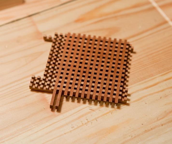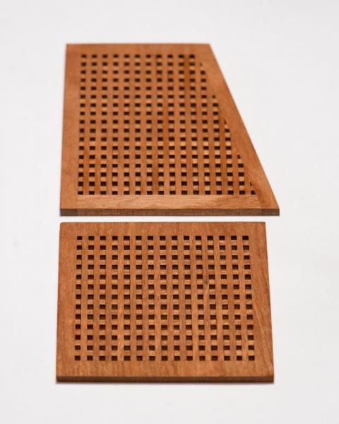 W ramach odpoczynku od sklejki i sosny podłubałem "w temacie mahoniu". Wyszło mi, że prawdziwy amerykański mahoń jest nie do zdobycia nad Wisłą, a rzucał się przez morze po drzewo nie będę. Pozostają eksperymenta z pseudomahoniem afrykańskim. Na pierwszy ogień pójdą gretingi w liczbie dwóch. Nie posiadam frezarki, więc spróbuję gretingi wyfrezować na pilarce z drobnozębatą tarczą grubości 0,5 mm. Zmodyfikowałem pilarkę dorabiając ze sklejki dodatkowy stolik na prowadnicach. Podziałka z czarnych kwadracików posłuży do ustawiania szerokości rowków i odstępów między nimi. Rowki mają szerokość 2,5 mm, więc trzeba przejechać po pile kilka razy. Idzie całkiem szybko, a przy okazji unosi się delikatny, cynamonowo-goździkowy aromat afrykańskiego drewna. Jeszcze pociąć na plasterki… poskładać do kupy, skleić… po przycięciu na wymiar dokleić ramkę… i gotowe. -