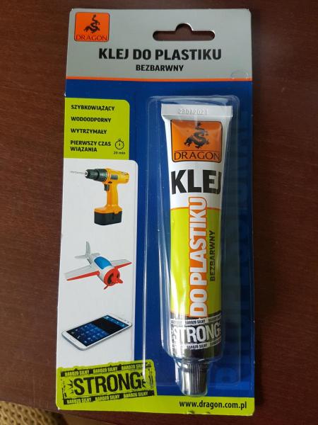 Wczoraj wieczorem usiadłem do klejenia. Popatrzyłem - na tak małej powierzchni styku to nie ma prawa wytrzymać. Uruchomiłem internety - średnia cena 1,5 PLN. Za tą cenę to szkoda nowy klej otwierać. Dzisiaj dreptam do sklepu