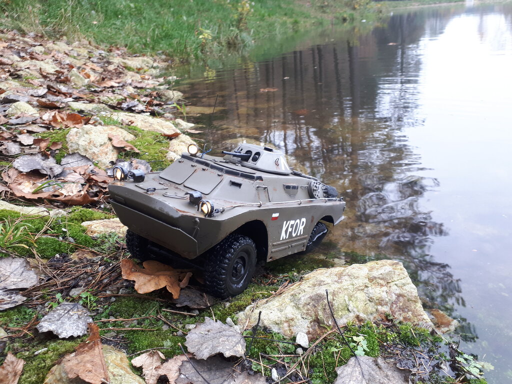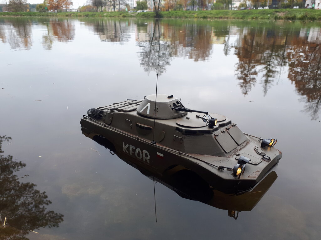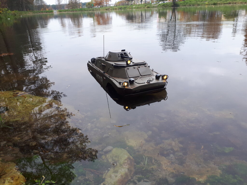 Ok. No to BRDM 2 popłynął. Nie wiem czy tutaj ktoś zagląda. Zostało ewentualnie dodać śrubę napędową o większym skoku. Tak się prezentuje w wodzie. 20201110_103839.mp4 20201110_104013.mp4 -