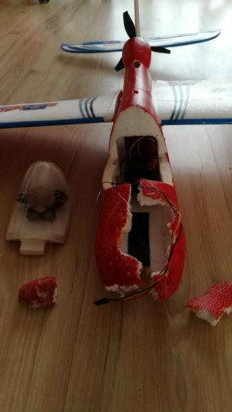 Nie wiem, jak ja robiłem wyjście z pętli, całkowicie zgubiłem orientację jak leci model - powinien być dziobem w dół górą do mnie, ale widziałem paski od spodu. Na chwilę się rozkojarzyłem chyba. Jeszcze mam zamiar go skleić i dalej katować, ale chyba czas ulotnić FunGlidera oraz FunCub'a, a może jednak lepiej kupić najtańszego kit'a pioneer / beta / sky surfer... będzie taniej w razie czego. - skrzydła jeszcze bardziej zwichrowane - kadłub w 3ch częściach, zdeformowany - pęknięty orczyk serwa skrzydła - pęknięta kabia (w tym sklejka w środku) - wyrwane jedno łączenie do silnika - pakiet 2.5m dalej - czujnik napięcia metr dalej - misiek (kabina) jeszcze dalej - misiek przesunął się w kabinie (musiał mieć niezłe przeciążenie) Rurki w skrzydłach oraz łącząca całe (w jednym już raz była wymieniana). Dziwi mnie to, gdyż skrzydła były imbusem dokręcone (może przez to zwichrzenie się powiększyło?), więc spodziewałbym się popękania ich. Za to (niestety) rozwaliło kadłub chyba (gdzieś ta energia musiała się rozładować). Serwa działają. Silnika nie mogłem sprawdzić, gdyż wyrwało jedno łączenie (pakiet pociągnął regulator a dalej już wiadomo). Czujnik napięcia działa. Słowem: straty niewielkie. Już się kąpie we wrzątku Zobaczymy, jak będzie latać po sklejeniu (jakie wychylenia lotek). W sumie, to już miał niezłe przeżycia (pierwszy model, brak osoby wprowadzające mnie - wszystko samouk...): - kabina 7x klejona (teraz będzie ósmy raz) - ster wysokości na zawiasach - złamany stabilizator poziomy - rozklejanie stabilizatorów (źle był wklejony poziomy) - wymieniane rurki - zwichrowane skrzydła - sępi dziób - pęknięta listewka w kadłubie (trzymająca łączenie skrzydeł) - złamany ogon Ale za to normą były: - pętle - beczki - loty na plecach (na wysokości 2m już nawet) - loty pionowo w dół i zaciągany na maxa ster wysokości (przez to musiałem wstawić zawiasy) - "latał" przy porywach 56km/h i udało mu się wylądować (stabilizator z S8R na maxa, regulatora nie dało się dotknąć)