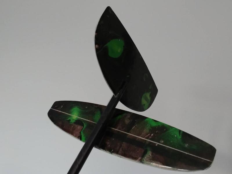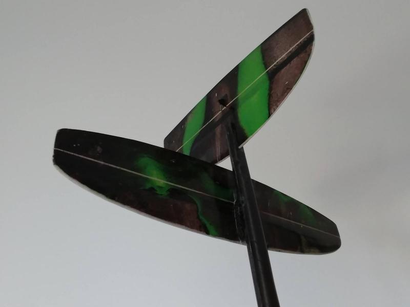 20. Odpowiem po kolei: @Marku (Kołpak) Tak Jak cZyNo napisał jest to kołpak Od Vladimira - do dostania u producenta: http://f3j.in.ua/hyper-spinner-30.html lub na stronie hyperflight.co.uk Uważam, że jest on stosunkowo tani w porównaniu do konkurencji, ale faktycznie można bez przeszkód do tańszego wyposażenia F5j dodać standardowy kołpak Ø30mm za ok. 30zł. Model nie zmierza do Maxa'y - projekt bazuje na profilu SynerJ opracowanym przez Geralda Tylora, nieco zmodyfikowanym po testach w programie XFLR. Powierzchnia stateczników i długość ramienia to też parę moich wyliczeń + otrzymana sugestia by powiększyć statecznik pionowy/ster kierunku. @Konradzie (Regulator, serwa, Carboline) Nie miałem dotąd problemu z regulatorami HK, mają też dość dobre opinie w internecie. Warto zauważyć, że silnik będzie pracował max 30sekund i pobór prądu wyniesie max ~25A, dla regulatora 40A przegrzanie nie powinno mieć miejsca. Chyba, że chodzi o jakość lutowania lub niską jakość stabilizatorów napięcia. Jaki inny tani, pewny regulator proponujesz zastosować? Tak samo proszę o propozycję serw. 50-100zł więcej na serwa to 300-600 więcej na model czyli do + 20% całości kosztów. Serwa z przedziału 70-120zł chyba nie będą wyraźnie lepsze od przedstawionych chińskich odpowiedników. Tak, też lubię mieć w modelu dobrze centrujące, mocne serwa np. MKS'y, ale nie w każdym projekcie precyzja i moc jest priorytetem. Stateczniki węglowe nie są aż tak kosmicznie drogie, ale to fakt, tkanina szklana na stateczniki kosztuje tylko 5zł, a stateczniki prezentują się też dobrze (zdjęcia poniżej). Jeszcze tylko słowo o idei przyświecającej LOFTY'iemu... Model ma w zamierzeniu ułatwić, umożliwić starty w F5j bez zostawiania pieniędzy za granicą lub po prostu nieco niższym kosztem. LOFTY może być traktowany jako model do startów, treningowy lub zapasowy. Chcę sprawdzić co w takim modelu da się zrobić tanio i przy tym wystarczająco mocno. Docelowy rezultat powinien pozwolić na przyzwoity występ w zawodach (o ile pilot będzie podejmował dobre decyzje, a warunki nie faworyzowały mocniejszych modeli czy to przy lądowaniu czy to ze względu na ograniczoną możliwość balastowania). P.S. Odnośnie zaawansowanej technologii - po zabawie z pierwszym skrzydłem w technologii VB, stwierdziłem, że powstaną foremniki skrzydła. Testy serw, napędu przeprowadzę na modelu z worka - będzie cała zima na ew. zmianę wyposażenia w docelowej wersji Masy stateczników szklanych: Pionowy 23g - to będzie ostateczny layup w wersji szklanej, Poziomy 33g