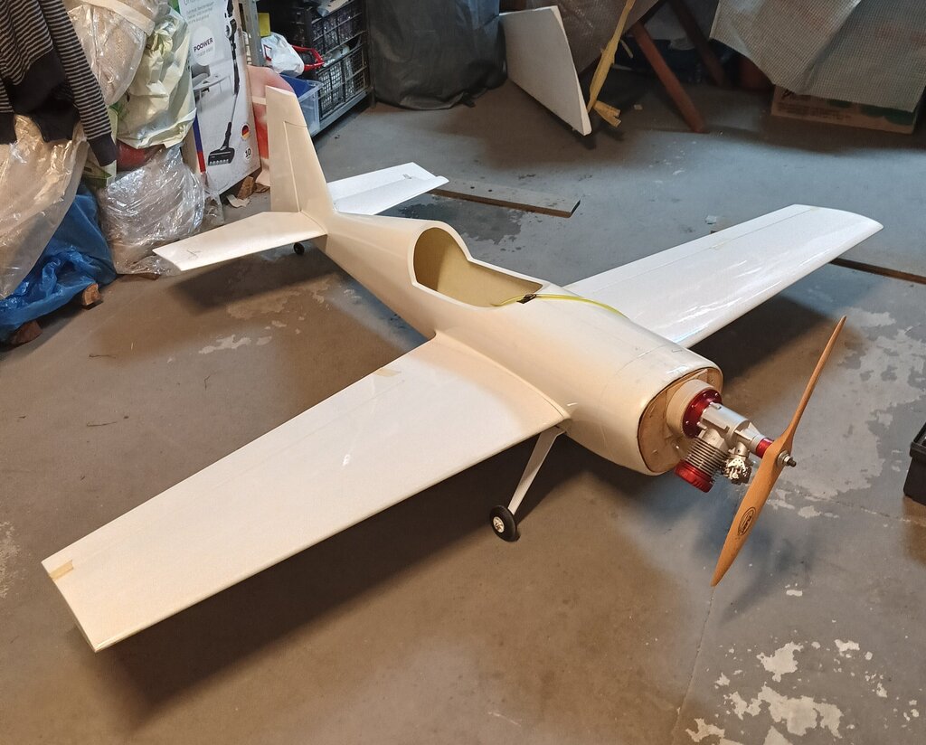Model niestety jeszcze nie gotowy, pozostało zamontować serwa i elektronikę. Generalnie to myślałem pierwotnie że oblatam już model w tym roku ale się nie wyrobiłem ze wszystkim. Na chwilę obecną model poskładałem aby sprawdzić wyważenie modelu i ogólnie czy wszystko pasuje. I jest Ok, silnik jest trochę ciężki ale serwa w ogonie i zasilanie go zrównoważą i powinno się obyć bez dodatkowego dociążania. Tak się prezentuje na kołach W następnych postach wstawię trochę fotek ze szczegółami co i jak zrobiłem w modelu. Muszę jeszcze przymierzyć maskę silnika, jak będzie ten dystans odpowiedni, to może zamienię go na tuleje 35 mm ale to ułatwi tylko montaż silnika ale wagi nie zmieni. Pozdrawiam