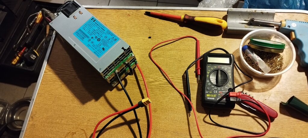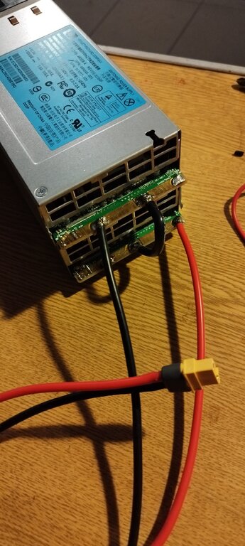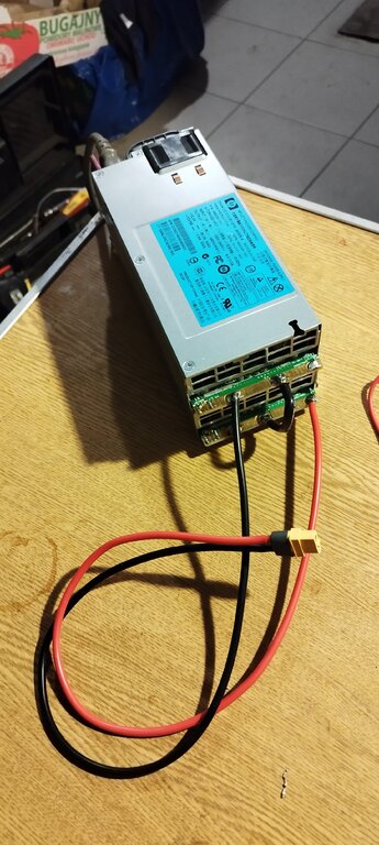 Zdecydowałem się na budowę zasilacza 24V ponieważ te o mocy pod 1000 watt kosztują trochę złotych... Za 80 zł nabyłem dwa zasilacze serwerowe HP DSP 460 EB. Plan był taki że przerabiam jeden zasilacz likwidując kontakt PCB z obudową zasilacza gdyż przy szeregowym połączeniu dwóch z nich mamy zwarcie. Zasilacz przerobiłem i zaizolowałem PCB podkładkami od tranzystorów. Do startu zasilaczy trzeba było wlutować rezystorki między 1 a 4 pin. Ja użyłem 760 ohm. Potem połączenie szeregowe wyjść zasilaczy i wyprowadzenie zasilania. Mam do dyspozycji 24V 920 Watt przy prądzie 38,3A. Zasilacz będzie pracował z ładowarką HOTA D6 650 Watt do ładowania pakietów 6s 5000 mAh. Oprócz tego będzie mógł zasilać z linii 12V(zasilacz nieprzerobiony) moją drugą ładowarkę 200 Watt. Weekend majowy sprzyjał wieczornemu majsterkowaniu którego przy kilku pociechach brak chyba każdemu. Może to nie była jakaś ekwilibrystyka ale cieszę że udało mi się coś sklecić. Pozdrawiam.