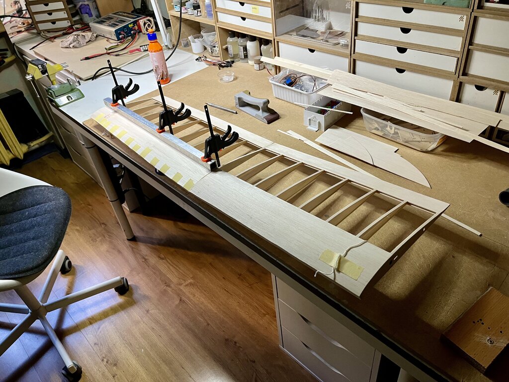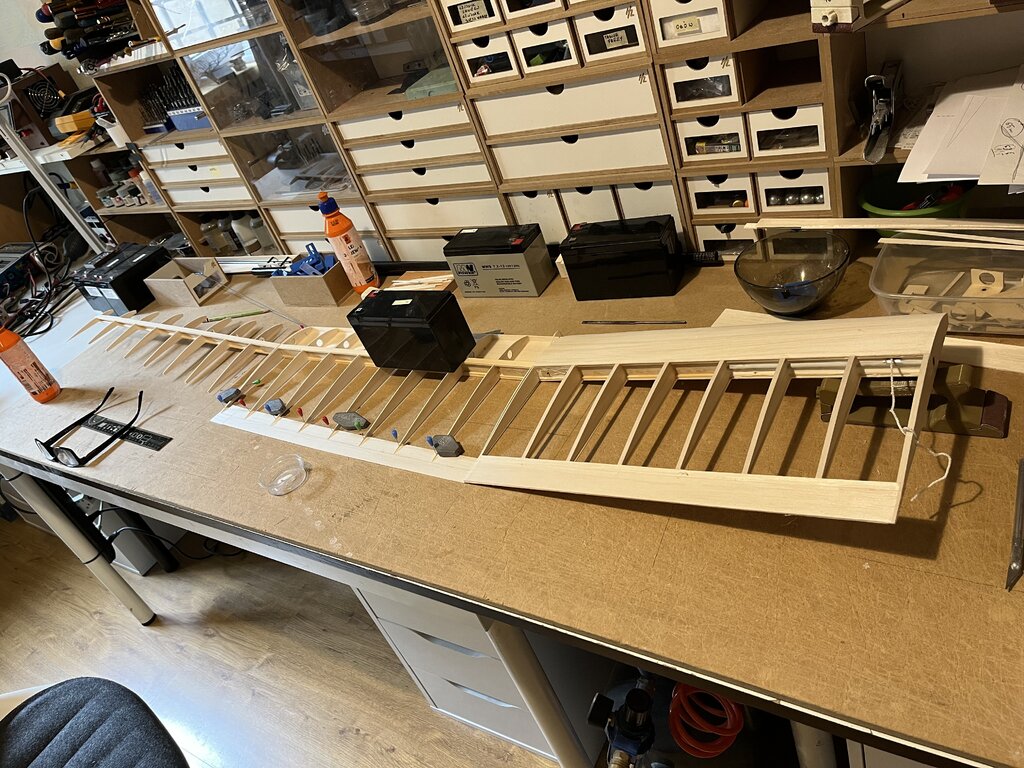 winglet był wycięty CNC, sklejony z dwóch kawałków i oszlifowany. żeberka są świadomie nie ażurowane, bo skrzydło jest lekkie, a tak mocniejsze -