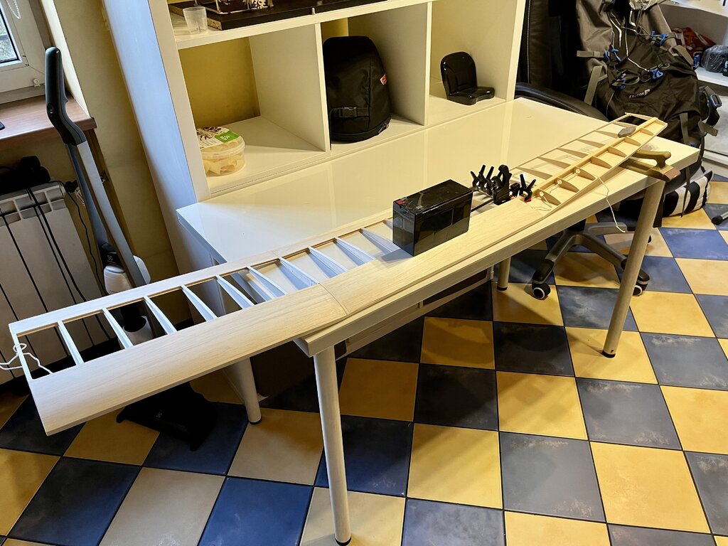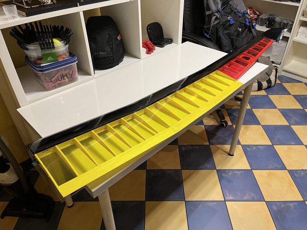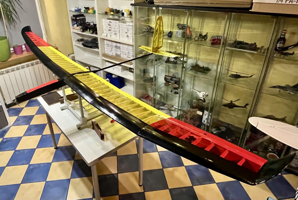 Wczoraj trochę podgoniłem. Oklejone stateczniki, zrobione mocowania serw lotek Wklejone w kadłubie, gniazda zasilania lotek, no i w pierwszym skrzydle wkleja się już wtyczka, na gotowo skrzydełka oszlifowane, winglety wklejone, teraz oklejanie i lotki. -