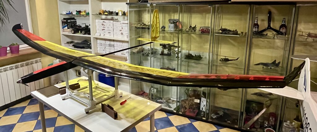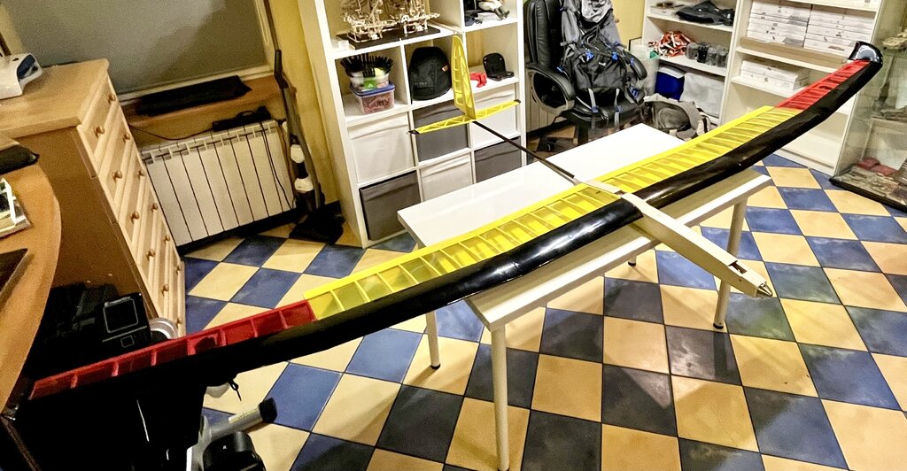 To nie jest mój projekt, tylko przeróbka czyjegoś. Ten długi nos ma jeden bardzo duży plus, bezproblemowe upchnięcie gratów i wyważenie. Mam kilka szybowców i wszystkie mają oprócz silników sporo ołowiu, bo zrobiono im króciutkie noski. O szarpaninie, by graty wlazły nie wspomnę. Kilka tych modeli lata, na razie nikt nie narzekał na ich stateczność, jedyne co to w wersji moto zmieniono usterzenie z V na klasyczne. Ale latają silnikówki z V i też radę dają Prace trwają, zostało wpięcie lotek i bowdenów kierunek + wysokość no i oklejenie kadłuba, więc jak pogoda pozwoli chyba w ten weekend oblot i się okaże co on wart -