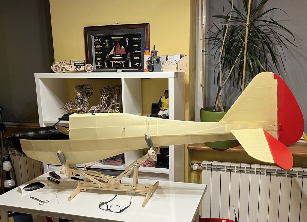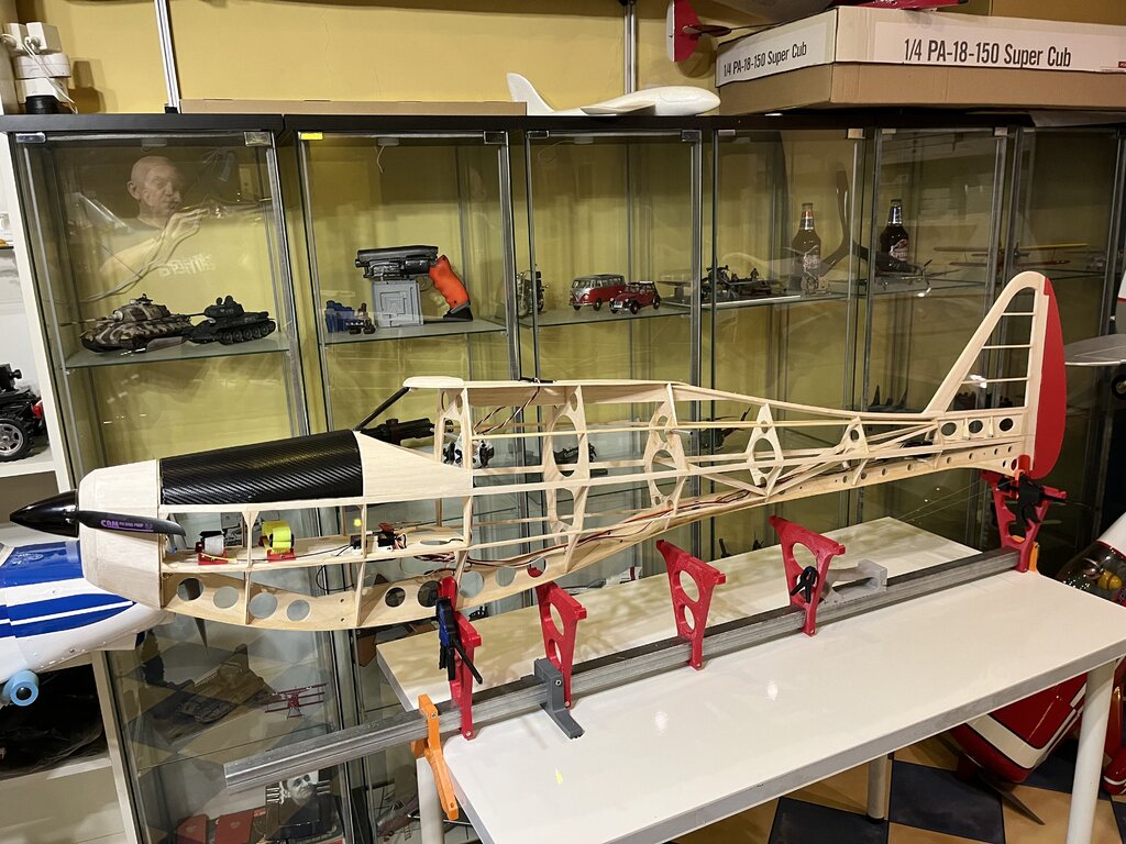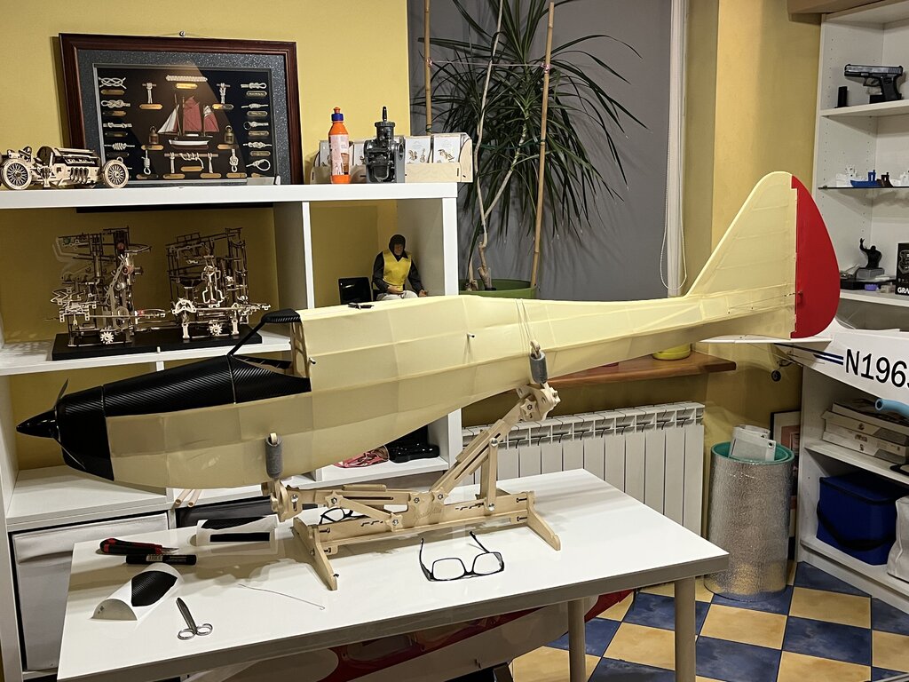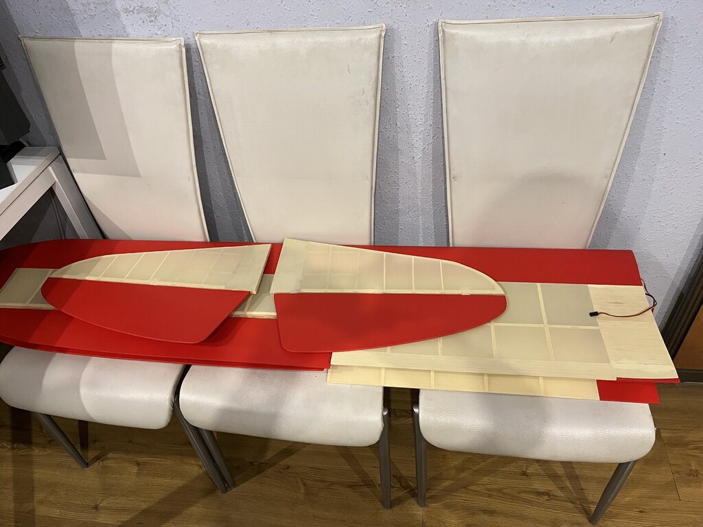 Skrzydła i stateczniki oklejone. Kadłub tartaczna robotę ma skończoną. Elektronika poza reglem obsadzona. Teraz zostało tylko oklejanie + szybka kabiny Na koniec tylko mocowanie dźwigni sterów i popychaczy poziomego , waga i lecimy