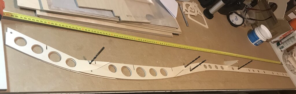 10. Kolejny dzień rysowania i cięcia Na fotce próbne złożenie, płozy kadłuba (element nośny całości) , jedyne 150 cm, a to jeszcze bez mordki z silnikiem i steru kierunku