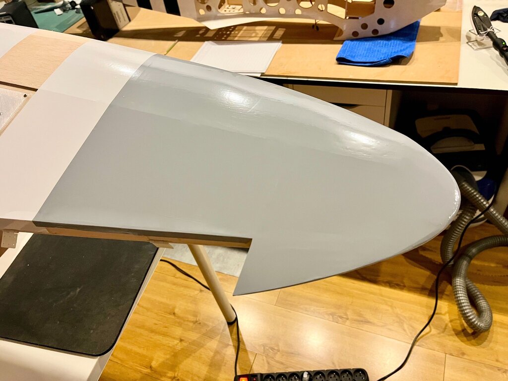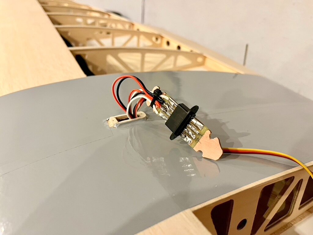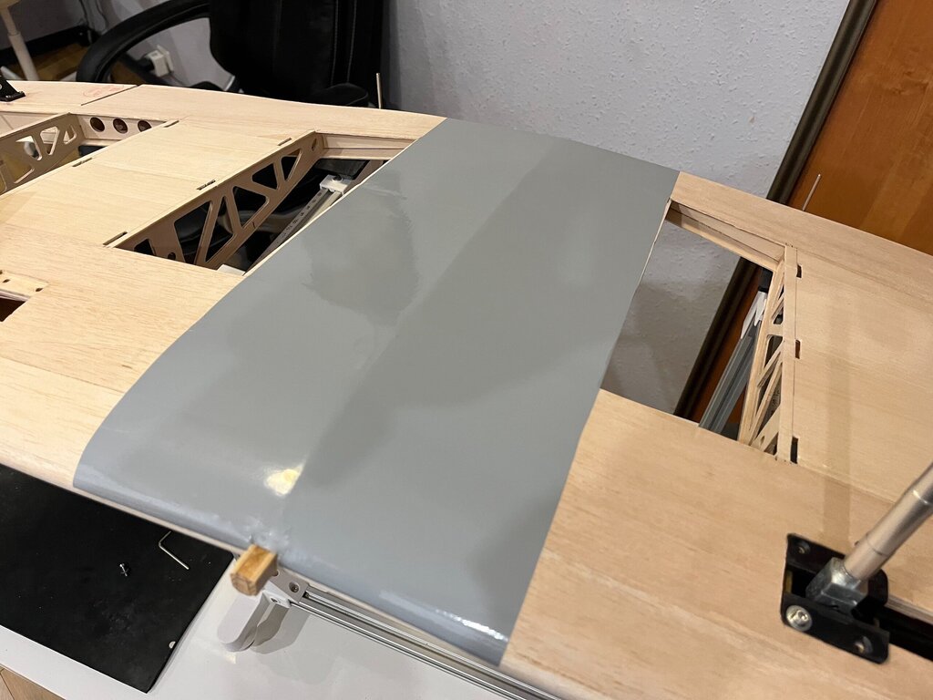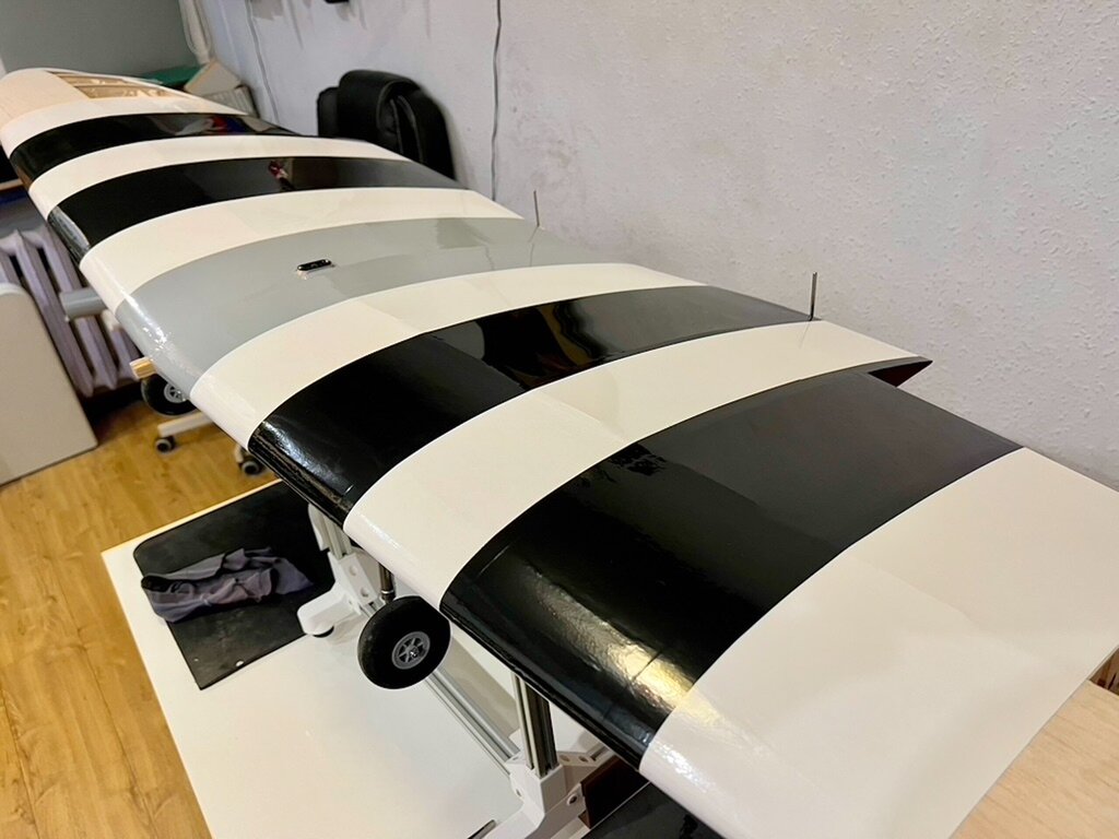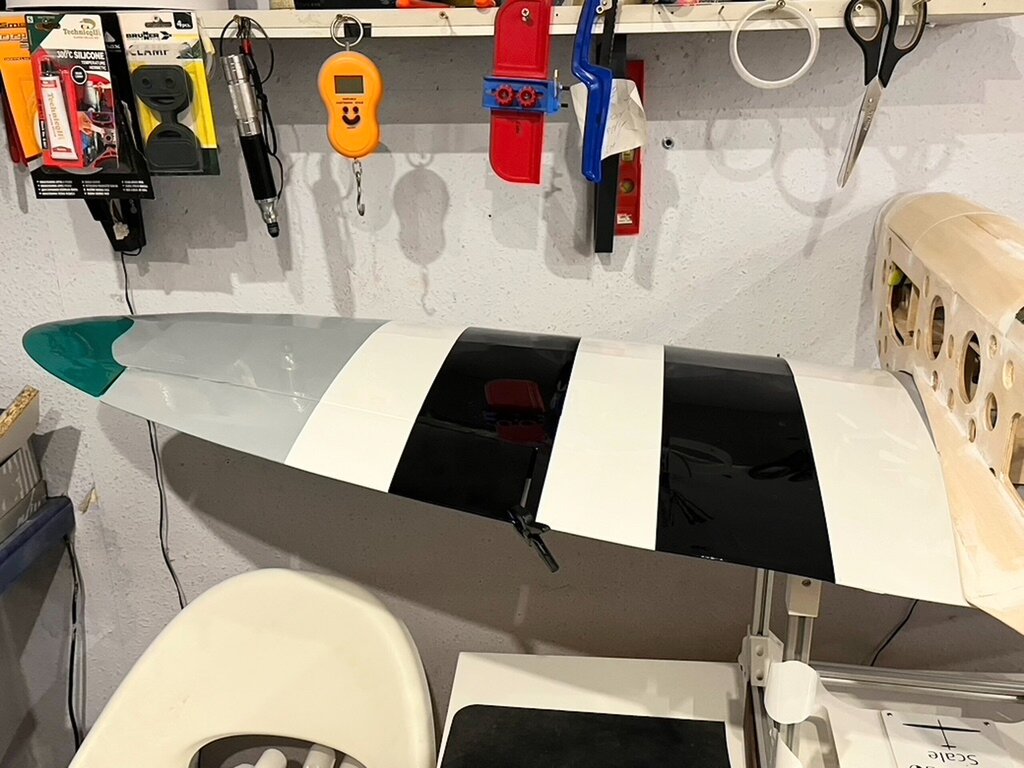 Kabelki puszczone. Gniazdo zrobione. No to oklejamy górę Po całości, na gotowo...No nie, jeszcze lotki, ale potem... Powrót do kadłuba, bo skrzydło będzie gotowe. -