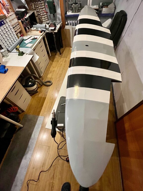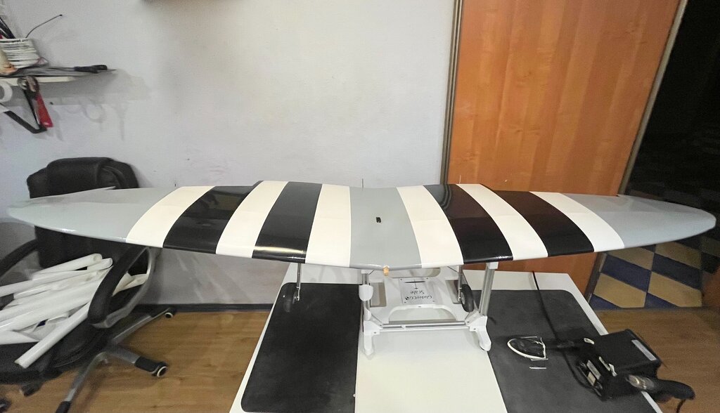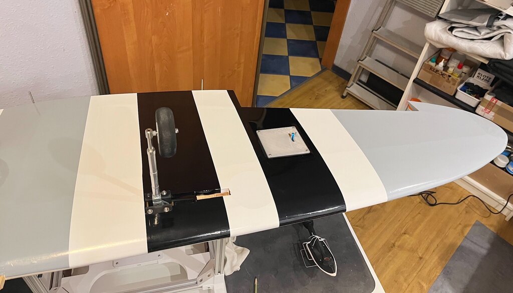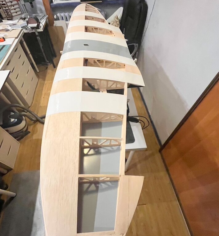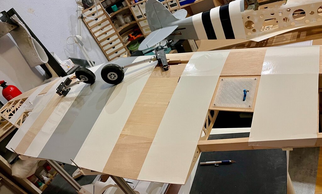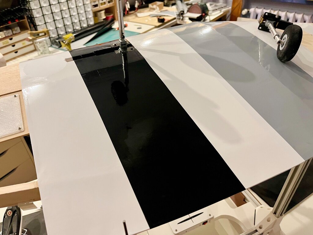Kabelki puszczone. Gniazdo zrobione. No to oklejamy górę Po całości, na gotowo...No nie, jeszcze lotki, ale potem... Powrót do kadłuba, bo skrzydło będzie gotowe. -