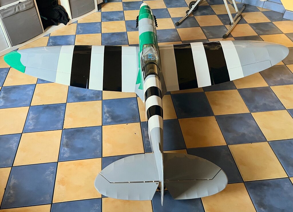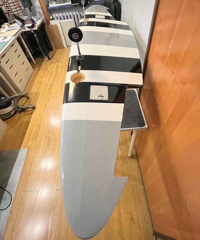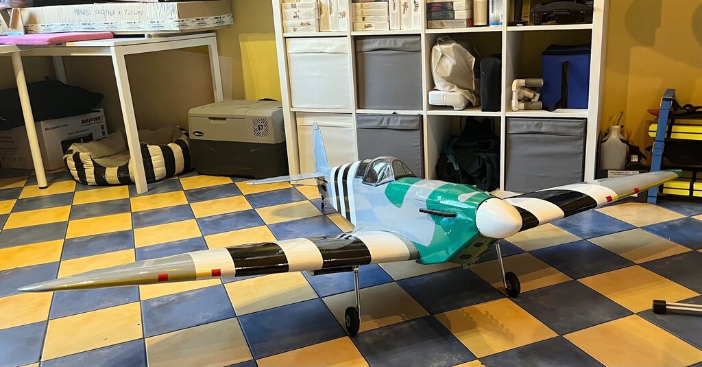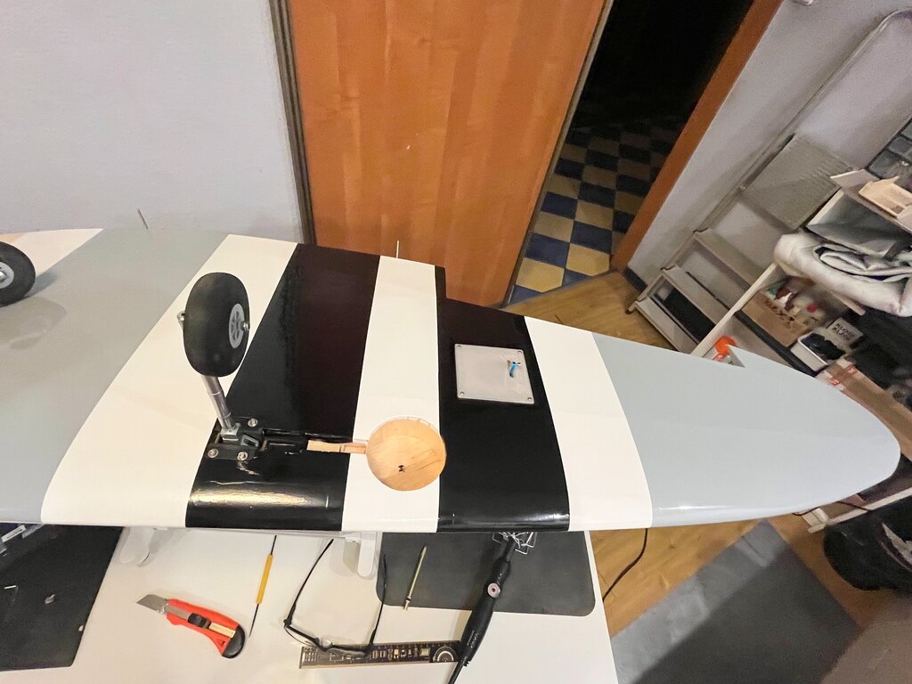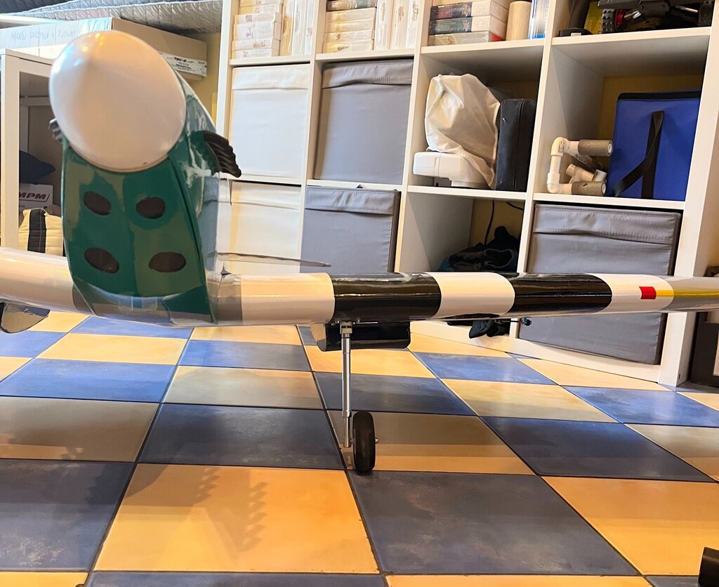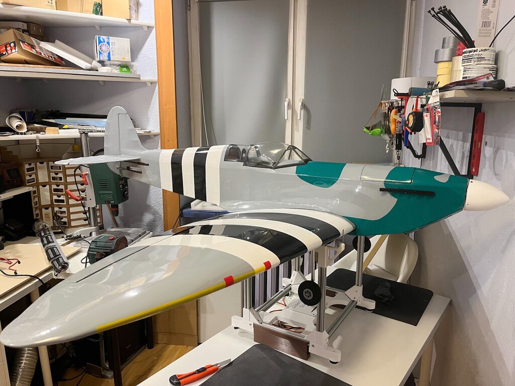 Pierwszy raz oklejony, na ziemi na własnych nogach. Teraz już tylko niewidoczne robótki z elektryką No i wycięcie kołpaka pod śmigło. Ponieważ to nie makieta to będzie zwykłe modelarskie dwułopatowe -