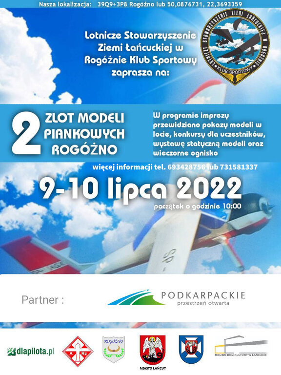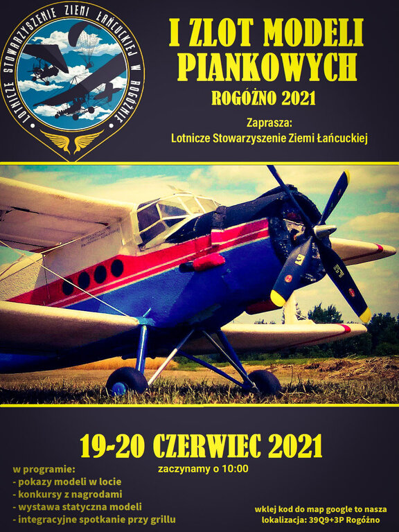Lotnicze Stowarzyszenie Ziemi Łańcuckiej w Rogóżnie Klub Sportowy zaprasza wszystkich modelarzy do wzięcia udziału w 2 Zlocie Modeli Piankowych w Rogóżnie. Wszystkie inne modele czyli balsiaki czy laminaty itp też mile widziane. Impreza jest dwudniowa i kontynuowana zgodnie z oczekiwaniami uczestników zeszłorocznego zlotu. Serdecznie zapraszamy też zarówno najmłodszych jak i dorosłych mieszkańców Rogóżna i regionu do odwiedzenia imprezy, na pewno będzie co oglądać ? Partnerem jest Województwo Podkarpackie W programie latanie, latanie i jeszcze raz latanie oraz podziwianie naszych konstrukcji w powietrzu i na ziemi. Będą też konkursy z upominkami i wieczorna integracja przy grillu. Możliwy dowóz obiadów po wcześniejszym zebraniu chętnych. W obrębie imprezy możliwość rozbicia namiotu ale niestety lądowisko nie dysponuje źródłem wody bierzacej na cele toalety wieczornej lub porannej. Jeśli będzie taka potrzeba zorganizujemy jakieś małe kanistry z kranikiem z mydłem i wodą. Możliwy też nocleg w pokojach sypialnych z łazienką ok 3 km od imprezy w Białobrzegach: Wynajem pokoi 728 924 767 https://maps.app.goo.gl/bU8BZa56nZDoVuiy7 Lokalizacja: 50°05'15.6"N 22°22'09.6"E https://goo.gl/maps/Vwc9bvBH77TzkCua8