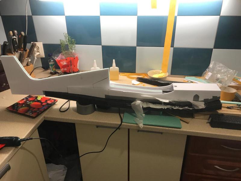 No to stępka położona. Wczoraj podziałałem trochę, trzymam się pierwotnych założeń - zrobiłem wewnętrzną strukturę z płyty piankowej: Część ogonowa jest wykonana z dwóch kawałków płyty piankowej przedzielonym dystansem z podkładu pod panele (6mm) pomiędzy płyty piankowe są również wklejone wzmocnienia z sosny 6x8 mm Całość jest bardzo sztywna i moim zdaniem bardzo rokuje. Co do samego klejenia to jest problem ale jest też rozwiązanie. CA nie topi i nie klei tego materiału, UHU POR słabo, klejem na gorąco łatwo stopić. Najlepszy sposób: powierzchnie, które chcemy pokryć zabezpieczamy dobrą taśmą, i na nią nakładamy klej: Po zaschnięciu nie byłem w stanie ręcznie rozdzielić tych dwóch kawałków! Na wszelki wypadek wzmacniam rdzeń tkaniną na żywicę. Co do wagi - to co na zdjęciu waży 314 gramów - kadłub na gotowo szacuję na ~650g, skrzydła ~ 400g, elektronika 450g