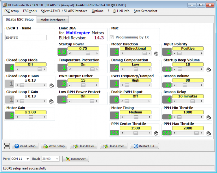 Udało się przeprogramować regulator i teraz silnik działa w trybie dwukierunkowym a tu filmik dla niedowiarków https://youtu.be/aNmmRdSmPqI Pomógł mi w tym program BlHeliSuite 16.7.14.9 od razu w opcji pokazało się jak pisali w linku do sklepu trzy tryby do ustawienia normalny , rewers , dwukierunkowy. Teraz tylko ustawić jakiś miękki start i hamowanie które parametry będą za to odpowiedzialne ze screena co najlepiej zmienić dla tych silników ?