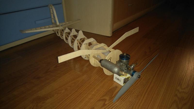 Witam wszystkich. Dwa lata temu zacząłem kleic model, taka hybryda wzorowana na dwóch planach. Model ma 1200mm i 1,5kg wagi. Na początku miał byc napędany dwusuwem o pojemności 4cc ( włoski staruszek Orion 4cc). Ale w końcu wpakowałem Saito 40 mk3 zakupiony na aukcji na ebayu. No ale jak w tytule, zgadniecie jaki to samolot ? Może mała podpowiedź ?? Podwozie było tymczasowe, mówie było bo model jest już w bardziej zaawansowanym etapie budowy. Pd. Nie karajcie mnie za możliwe błedy ortograficzne, wychowałem się i mieszkam poza krajem.