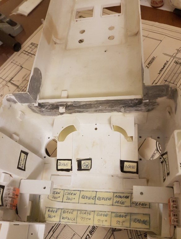 Ostatnie wieczory to..... montaż nowej zmywarki. Ech niech to..... . No, ale w końcu można wrócić do przyjemności. Połączyłem część nadbudówki z częścią maszynowni. Użyłem kleju epoxydowego (klej do metalu z domieszką pyłu metalowego - taki mi pozostał po innym zastosowaniu) wzmocnionego kilkoma warstwami tkaniny. Połączenie musi być mocne i sztywne i takie jest. Po czym nadmiar żywicy zeszlifowałem. Widoczny kanał dla przejścia kabli dla oświetlenie części maszynowej będzie uszczelniony silikonem. Komora maszynowni nad głośnikiem musi być szczelna, jako, że z niej jest ssanie wentylatora zasysającego powietrze chłodzące poprzez luki maszynowni i tłoczące do przestrzeni wewnątrz kadłuba..... Całość z pokładem udało się dopasować wprost idealnie. Nasuwa się bez oporu i bez luzu.... Wstępnie oszacowałem wagę kompletnej nadbudówki z całym wyposażeniem. Będzie około 3 kg. Dużo, ale wciąż pozostaje trochę miejsca na balast. -