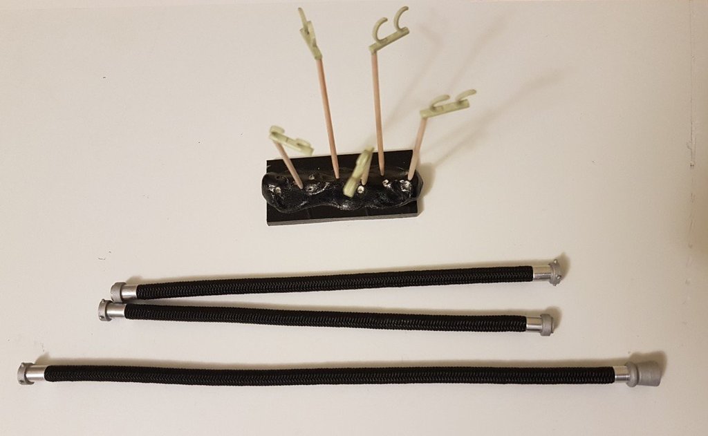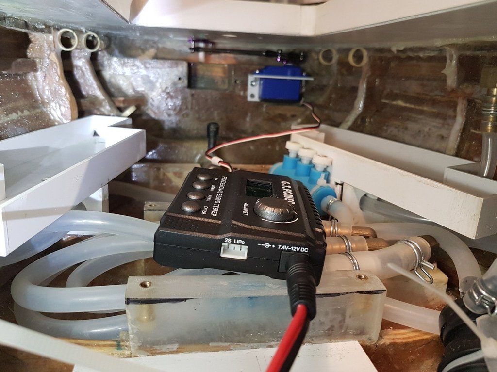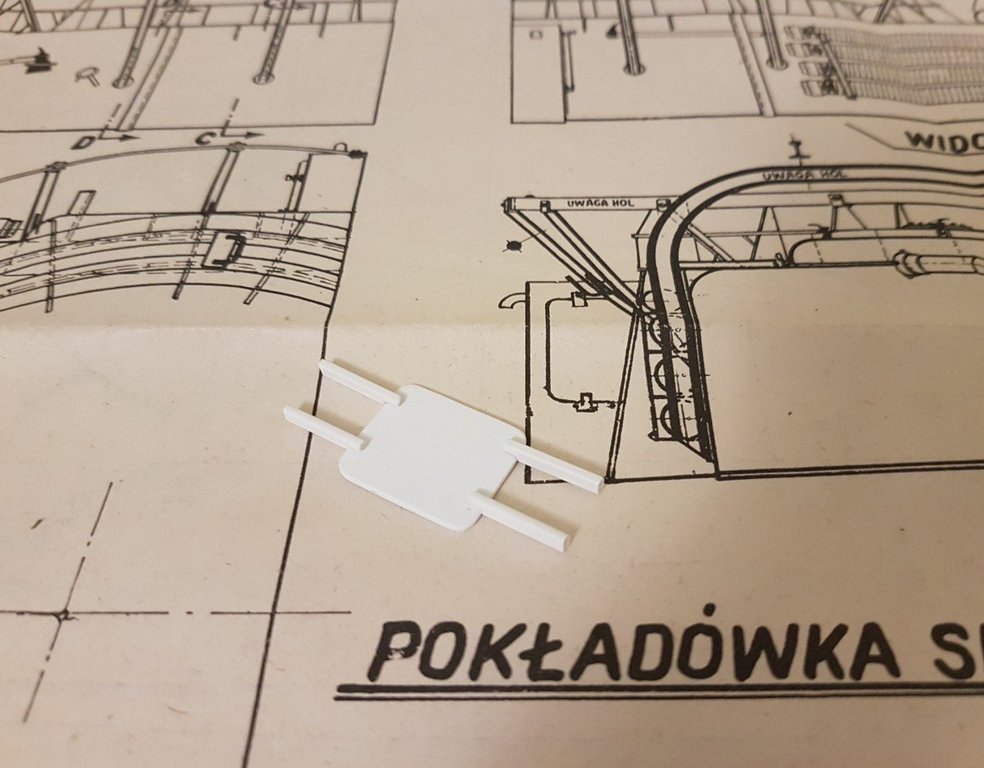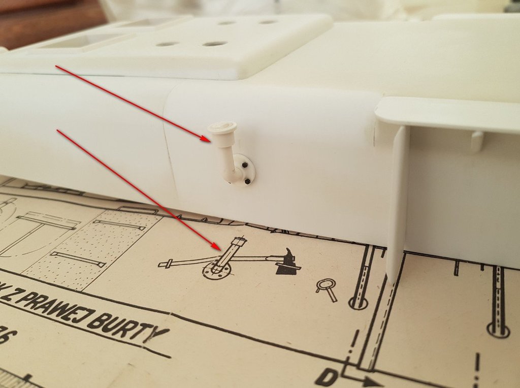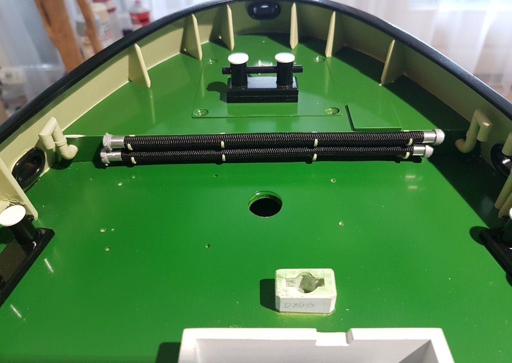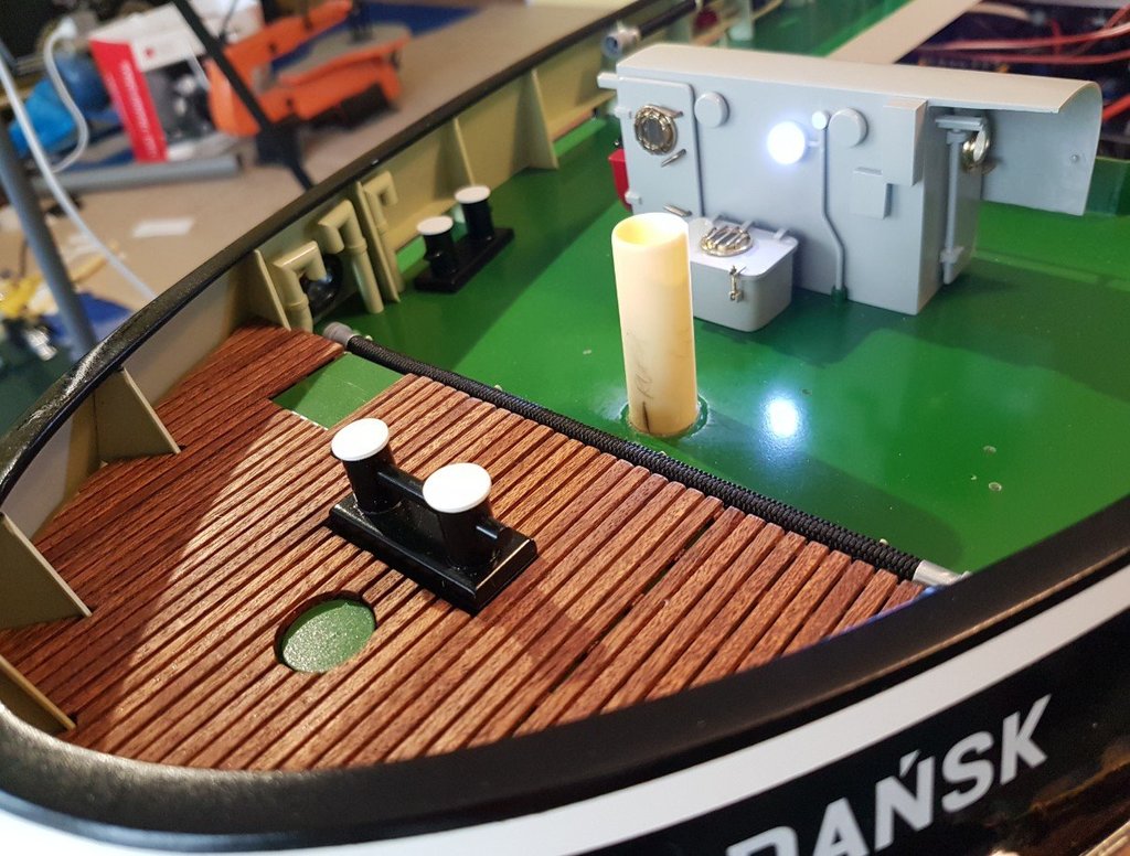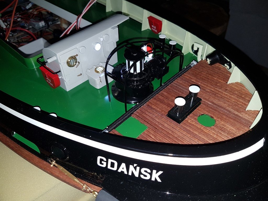 Chciałem docelowo zamontować pompki wodne, a tu zonk. Jedna zdeformowana termicznie. I do tego obroty jej mocno falują. Nawet nie potrafię powiedzieć kiedy i jak się to stało. Czekam na dostawę nowych. Tym razem OEM. Widać jaka cena taka jakość... Przed zamontowaniem kabestanu na stałe, trzeba zamontować węże ssące na podwyższeniu rufowym. A to uchwyty tych węży... Te 3 węże mogłem przyciąć na właściwą długość i pomalować zakończenia na srebrno. Tulejek aluminiowych nie malowałem. Pozostałe węże jeszcze muszą czekać na swoją kolej.... uszczelnienie pokrywy dostępu do cięgna steru..... Nie mogłem sobie odmówić trochę przyjemności i poukładałem elementy na dziobie. Małe światełko się pojawia, ale do ukończenia jeszcze daleko..... Odbijacze gumowe muszę jeszcze zdjąć dla zamontowania łańcuchów podtrzymujących. -