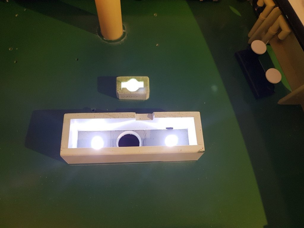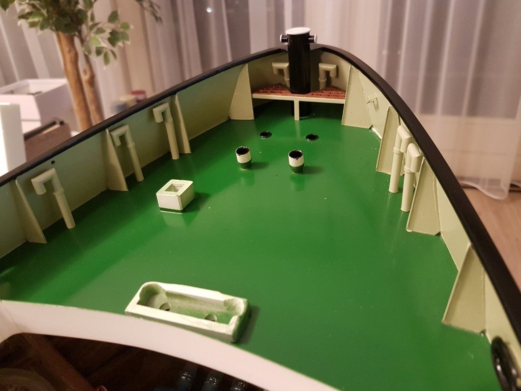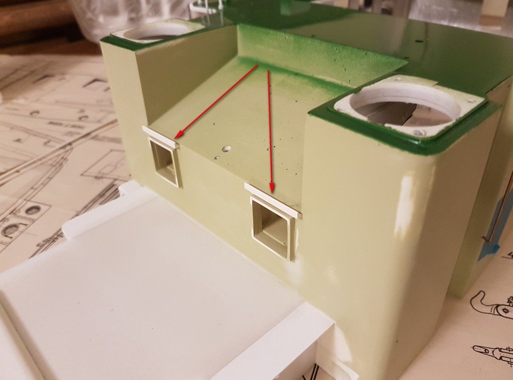 Przed połączeniem części maszynowej z nadbudówką muszę zrobić niezbędne elementy wyposażenia. Nawierciłem otwory pod zamontowanie zaworów w części rufowej. Użyłem zawory gotowe... https://modelemax.pl/en/akces-pokladowe/12527-adm--zawor-17x10mm-.html wklejone poszerzenia na części maszynowej.... oraz po szpachlowaniu i szlifowaniu wstępnym.... -