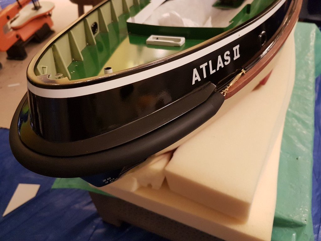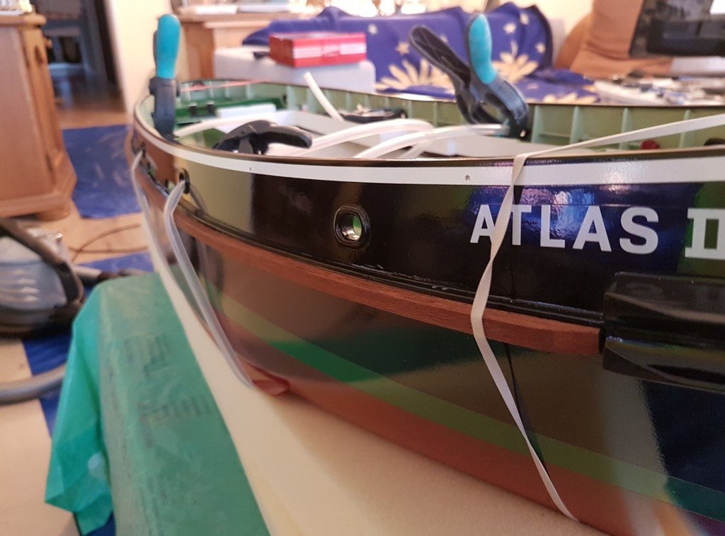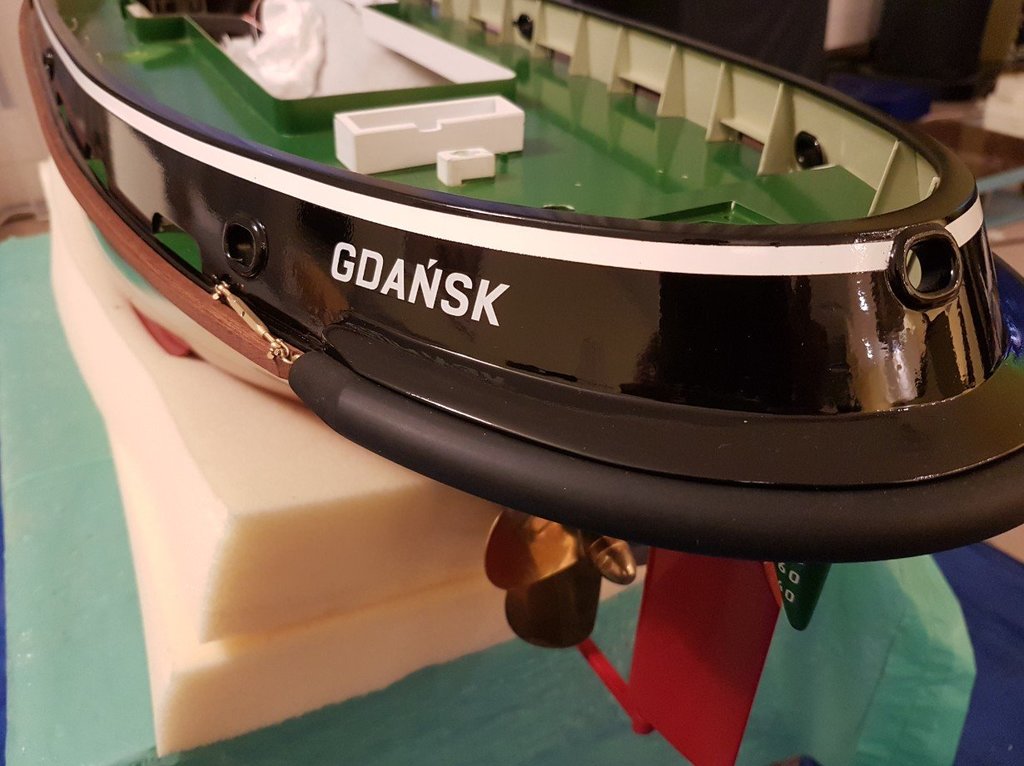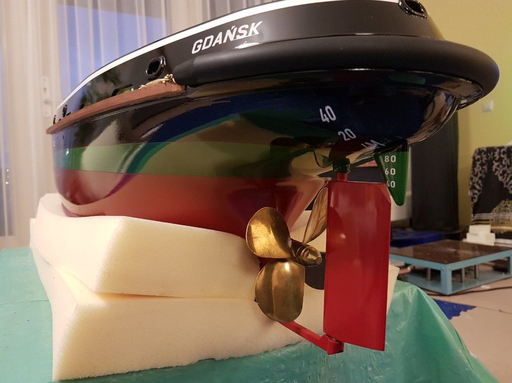 Stopień wejściowy do nadbudówki..... Ponieważ już czas na malowanie nadbudówki, a nie bardzo miałem czas i ochotę, zabrałem się za montaż finalny elementów na pokładzie. Przez ostatnie kilka miesięcy farba na kadłubie wyschła wystarczająco. Jako że, już nie będzie w zasadzie możliwości na położenie kadłuba do góry dnem, nałożyłem na część podwodną politurę samochodową... wkleiłem na żywicę odbijacze drewniane burtowe.... po czym zamontowałem śrubę i ster. Kadłub teraz spoczywa na gąbce, aby się nie rysował podczas przesuwania na twardych podporach.... oraz odbijacze gumowe rufowy i dziobowy.... następnie zamontowałem na pokładzie odpowietrzenia i polery cumownicze.... -