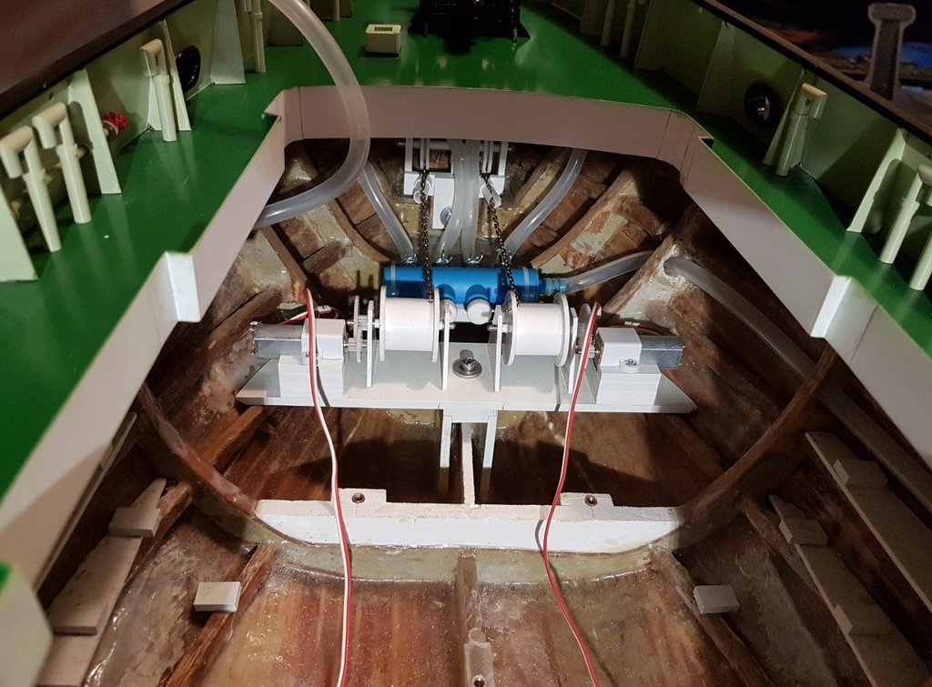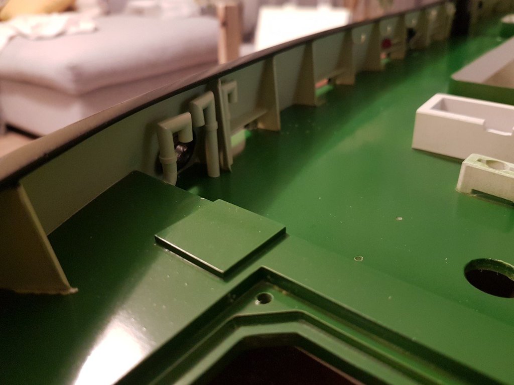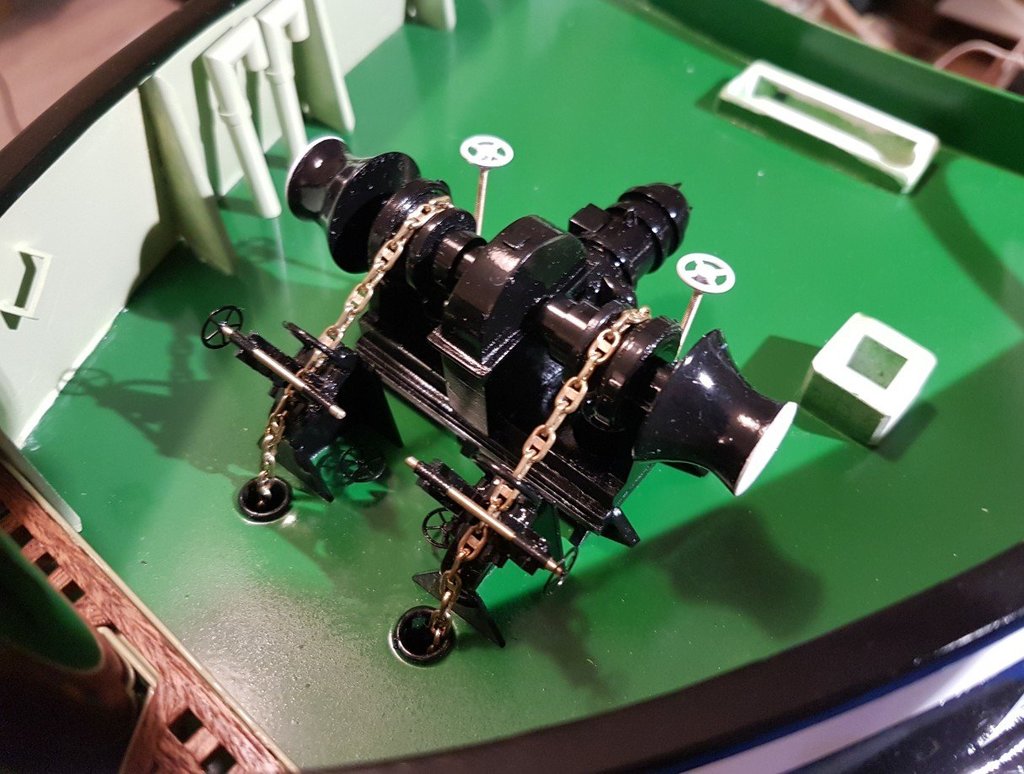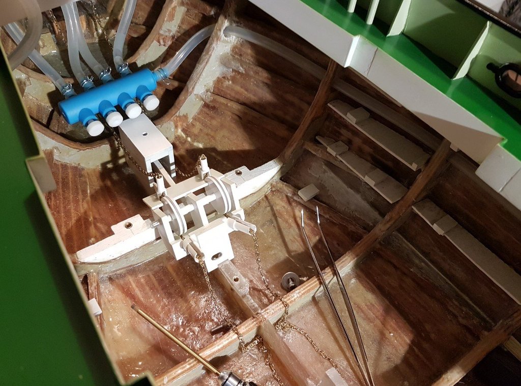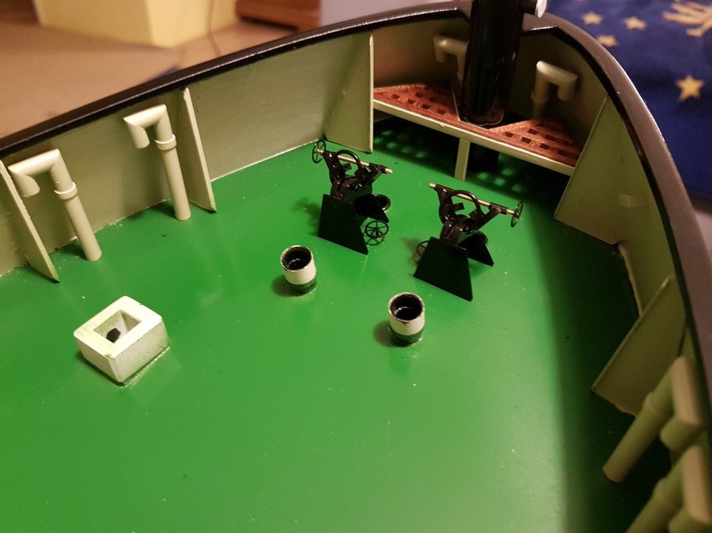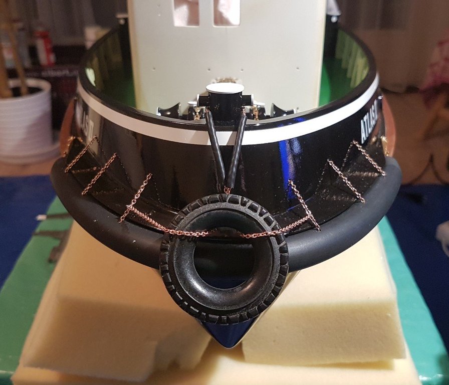 Dziś już tylko montaż ostateczny. Węże ssące na podwyższeniu rufowym na miejscu.... oraz greting. Boczne są wklejone na taśmę dwustronną, a środkowe demontowalne.... wąż na prawej burcie też na miejscu.... podłączone oświetlenie do pomieszczenia CO2 i zejściówki rufowej. Użyłem led 5 mm białe zimne.... oraz podłączony reflektor w pomieszczeniu CO2.... Kabestan jak i pozostałe elementy na pokładzie montuję na silikon. Jedynie pomieszczenie CO2 jest zamontowane na wcisk.... elementy rufowe już na miejscu.... podłączone oświetlenie w zejściówkach dziobowych..... przygotowanie do trasowania miejsca montażu łańcuchów podtrzymujących odbijacze.... użyty łańcuch... po przewierceniu odbijaczy gumowych wiertłem 1.5 mm i przeciągnięciu łańcucha za pomocą szydełka... i na miejscu.... pozostałe je naciągnąć i zablokować. stan aktualny modelu..... -