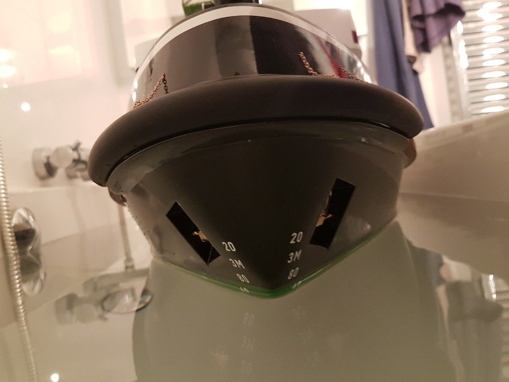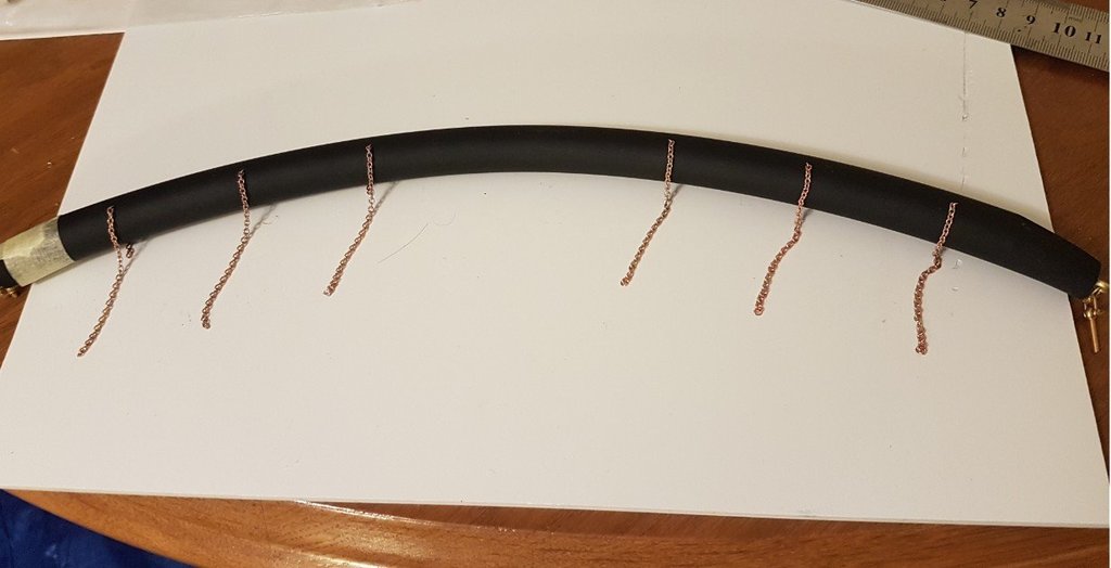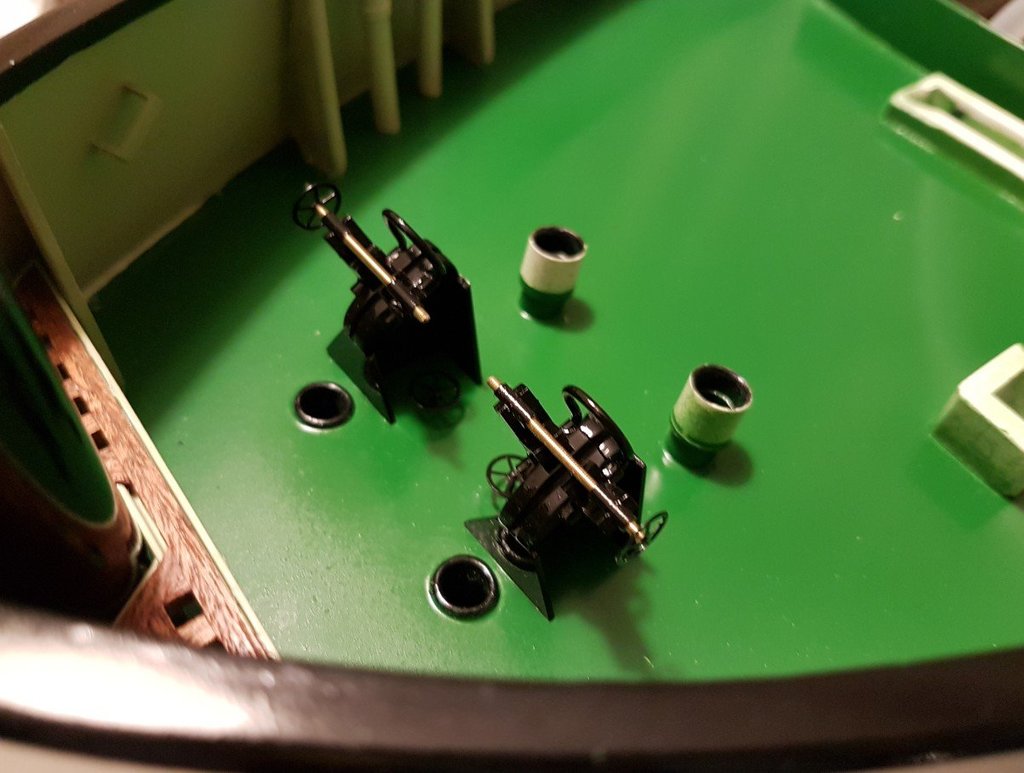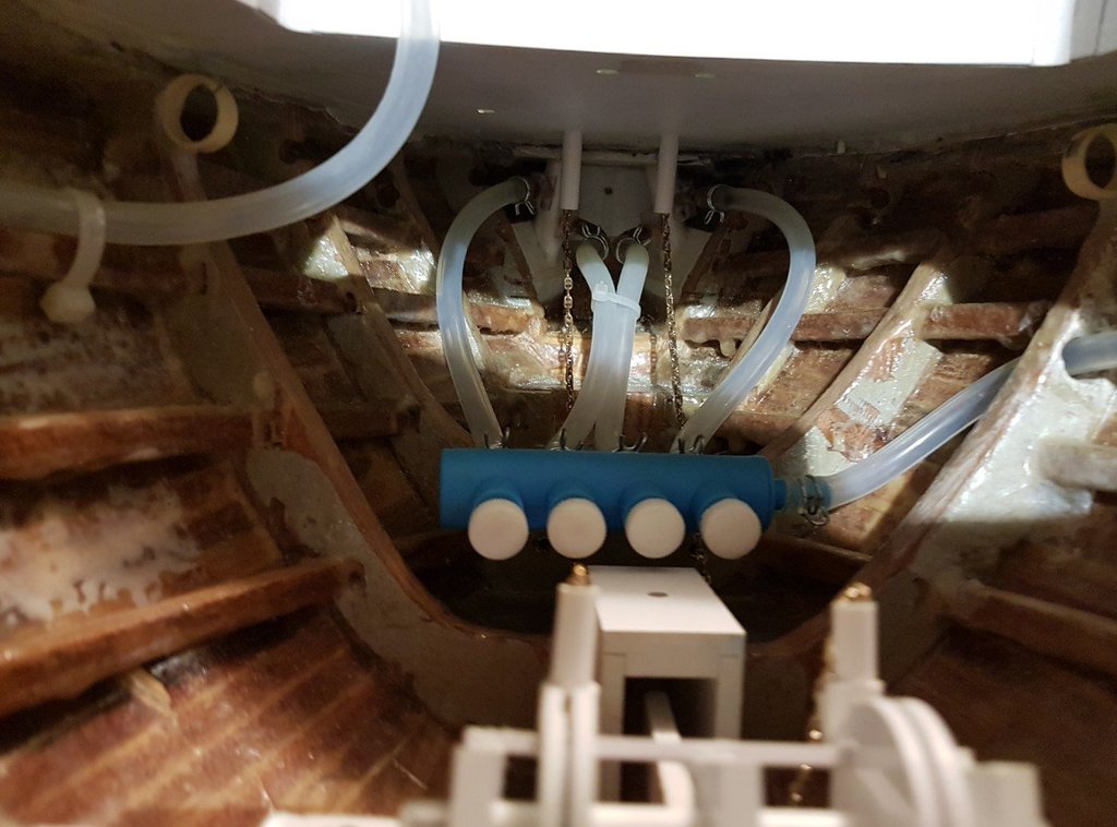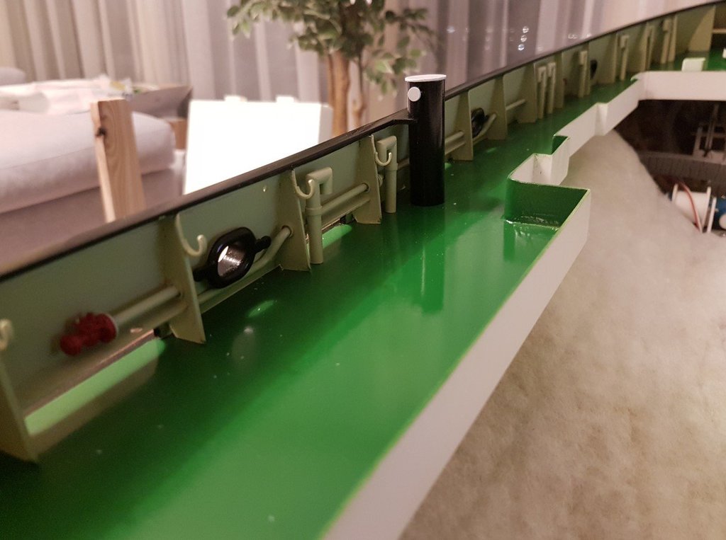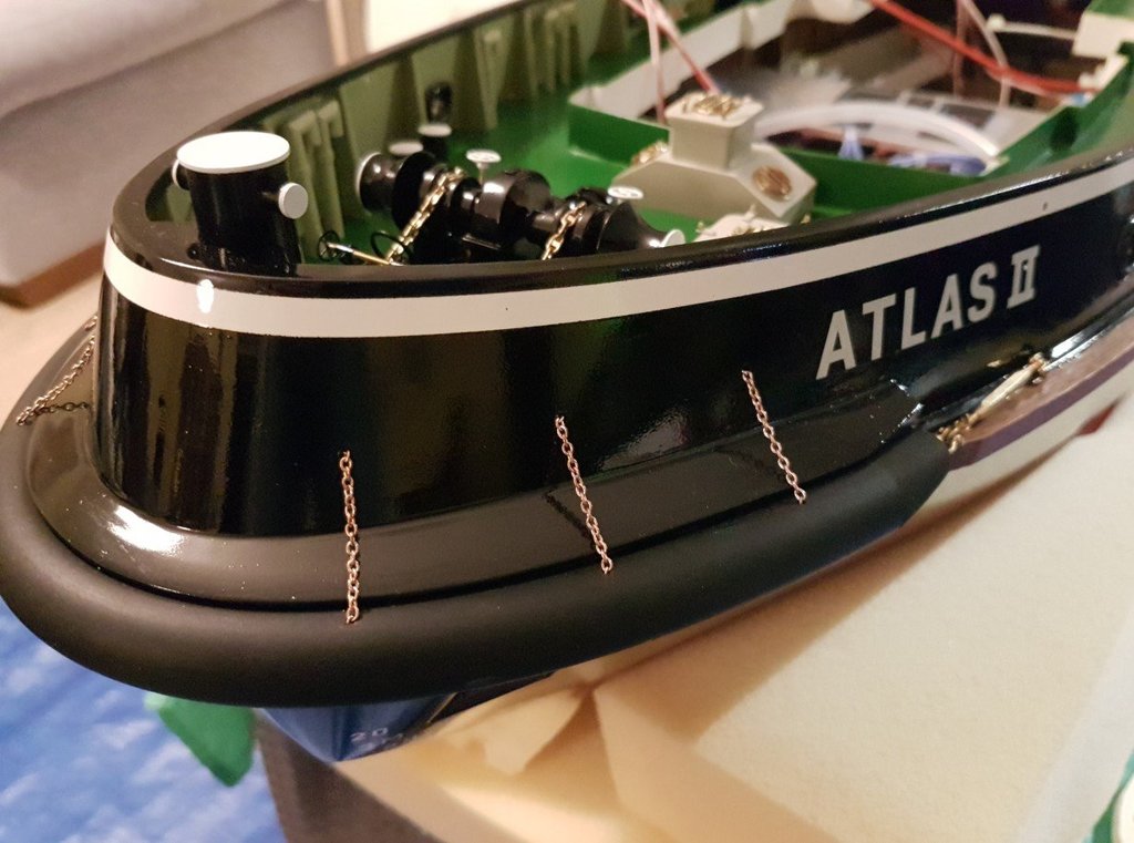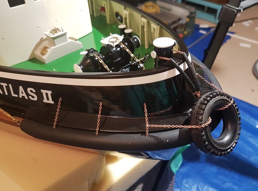 Dziś już tylko montaż ostateczny. Węże ssące na podwyższeniu rufowym na miejscu.... oraz greting. Boczne są wklejone na taśmę dwustronną, a środkowe demontowalne.... wąż na prawej burcie też na miejscu.... podłączone oświetlenie do pomieszczenia CO2 i zejściówki rufowej. Użyłem led 5 mm białe zimne.... oraz podłączony reflektor w pomieszczeniu CO2.... Kabestan jak i pozostałe elementy na pokładzie montuję na silikon. Jedynie pomieszczenie CO2 jest zamontowane na wcisk.... elementy rufowe już na miejscu.... podłączone oświetlenie w zejściówkach dziobowych..... przygotowanie do trasowania miejsca montażu łańcuchów podtrzymujących odbijacze.... użyty łańcuch... po przewierceniu odbijaczy gumowych wiertłem 1.5 mm i przeciągnięciu łańcucha za pomocą szydełka... i na miejscu.... pozostałe je naciągnąć i zablokować. stan aktualny modelu..... -