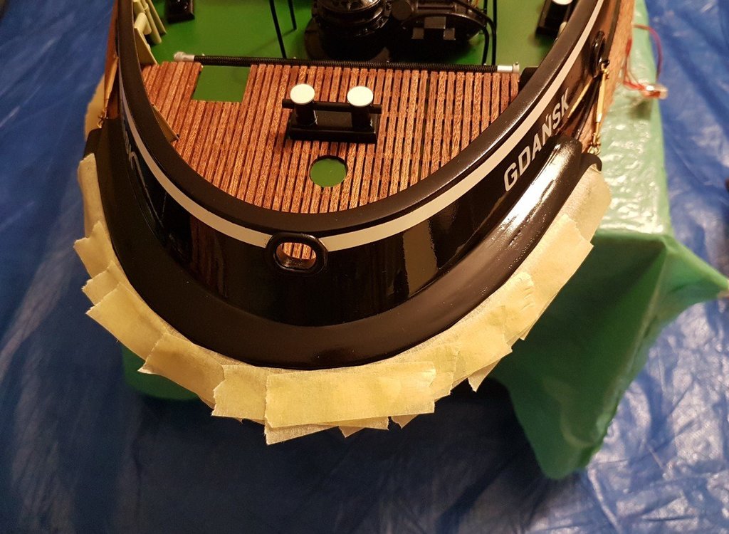 Przykrywam, przykrywam. Tyle, że pokład trochę ucierpiał przy malowaniu kadłuba. Jednak mgiełka farby się miejscami przedostała przez niecałkowite zamaskowanie i są miejscowe zmatowania. No nie jest idealnie. W końcu to ręczna robota ?. Może uda się te niedoskonałości na koniec zamaskować Sidoluxem. -