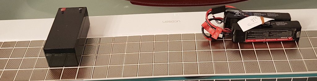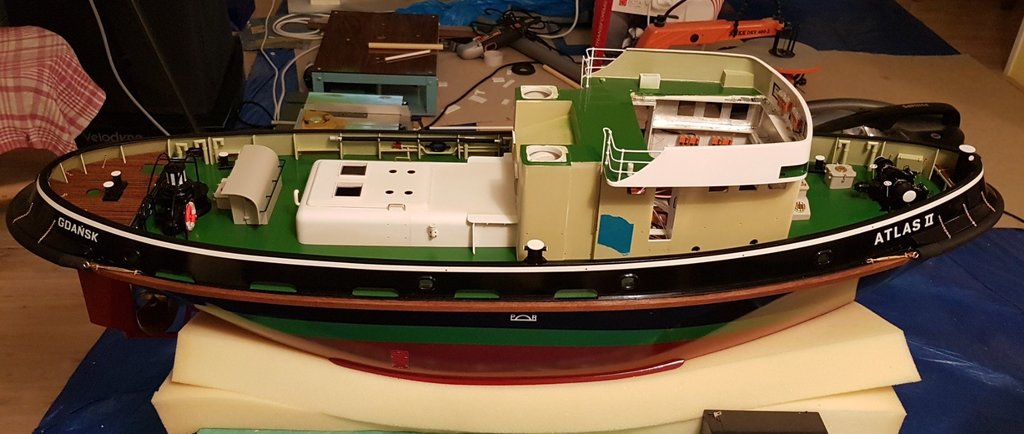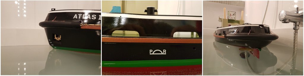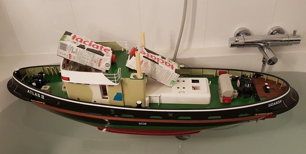 Dziś zrobiłem próbę wyporności. Ciężar symulujący nadbudówkę ułożyłem wysoko. Nie udało się zważyć modelu, bo ..... w wadze padła bateria. Brakujące elementy wyposażenia to 1,9 kg. Zastąpiłem je 2.1 kg mleka..... a tak to wygląda z poziomu wody.... Drugą próbę przeprowadziłem po wyjęciu baterii 1x12V (2,1Ah) i 2x lipo, razem 2,1kg. Baterię 12V zastąpiłem symulowaną wagą mniejszej baterii o wadze 0,57kg 1,2Ah. Ciągle w modelu są 2xlipo. Zmianę zanurzenia będę mógł wykorzystać na dołożenie balastu w celu poprawy stateczności. W tej chwil jest 2kg balastu, a dzięki odchodzeniu na bateriach będę mógł jeszcze dołożyć 1,5kg. W sumie 3,5 kg balastu da bardzo dobrą stateczność. Na akweny o dużym pofalowaniu będzie można wyjąć baterie dziobową i kolumnę głośnikową. To w prosty sposób odchudzi model o 2.6 kg. Miałem obawy, że będzie za ciężki, chociaż jest bardzo ciężki..... Poniżej zanurzenie prawdziwego holownika. Wyraźnie widać linię regularnego zanurzenia..... -