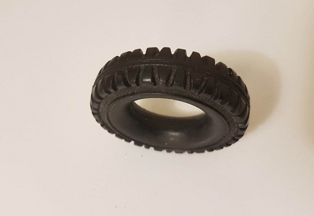 Co do baterii to dziobową zastąpie baterią Li-po o wadze max 0.4. Taka bateria to 4000-5000 mAh 3S. W ten sposób będę miał miejsce na 1 kg balastu i jeszcze 0,6 kg zapasu. Do malowania nadbudówki jeszcze trochę. Wcześniej trzeba zrobić obrotnicę haka i ją zamontować. Najpierw jednak projekt. W przerwie zamontowałem oponę na dziobie, która służyła jako ochraniacz odbijacza. Stare opony są po prostu bezpłatne, a odbijacz bardzo drogi. Trzeba więc go jakoś chronić. Do tego celu użyłem starą oponę, która się jakimś cudem zachowała, albo gdy planowałem budowę Atlasa to ją odłożyłem. Znalazłem ją przeglądając rzeczy w domu rodzinnym. Pochodzi z zabawki podobnej do tej jak poniżej, tylko jako zabudowę miała skrzynie ładunkową automatycznie podnoszoną, za pomocą sprężyny. Nie znalazłem dokładnie takiej samej w necie... Poniżej opona o której mowa. Pochodzi z lat 60-siątych. Więc pasuje do modelu wiekowo.... oraz zamontowana na Atlasie. Na osłony łańcuchów użyłem silikonową izolację z kabla elektrycznego..... -
