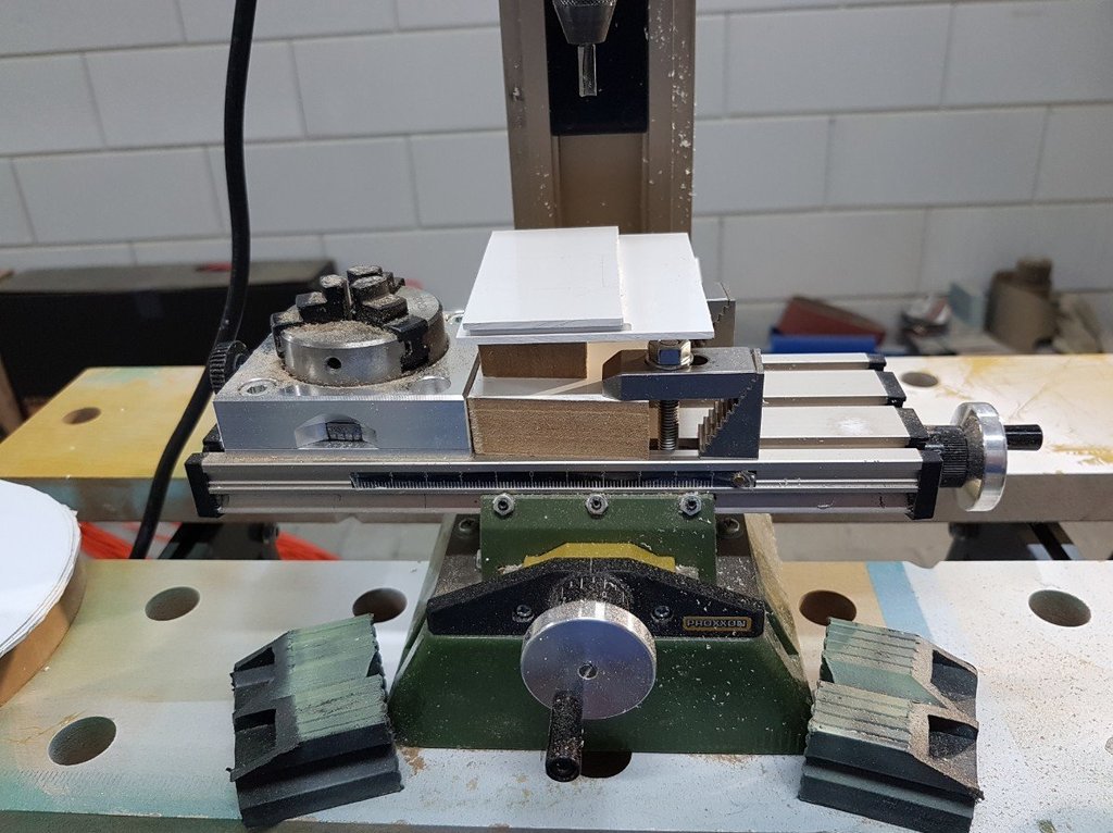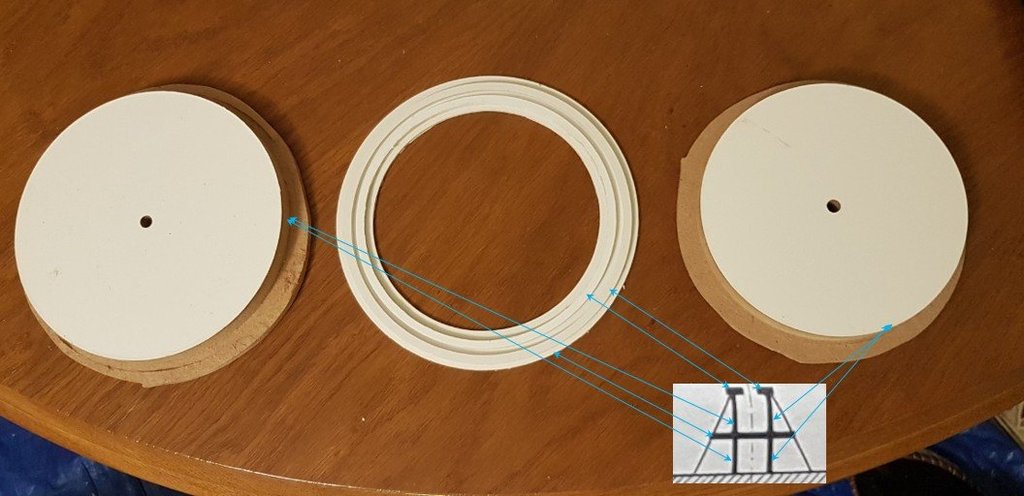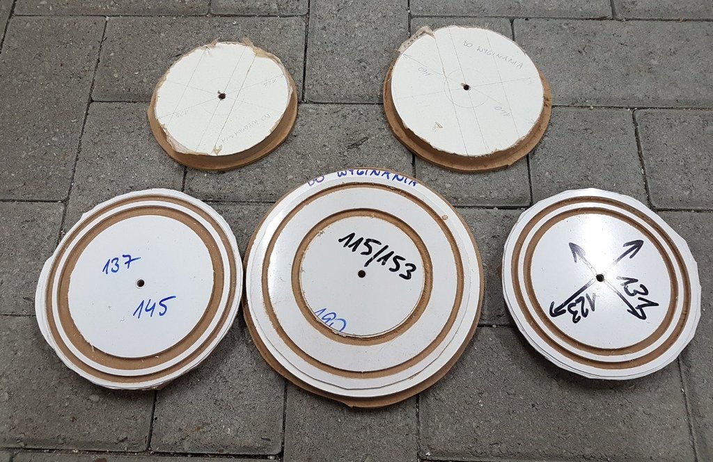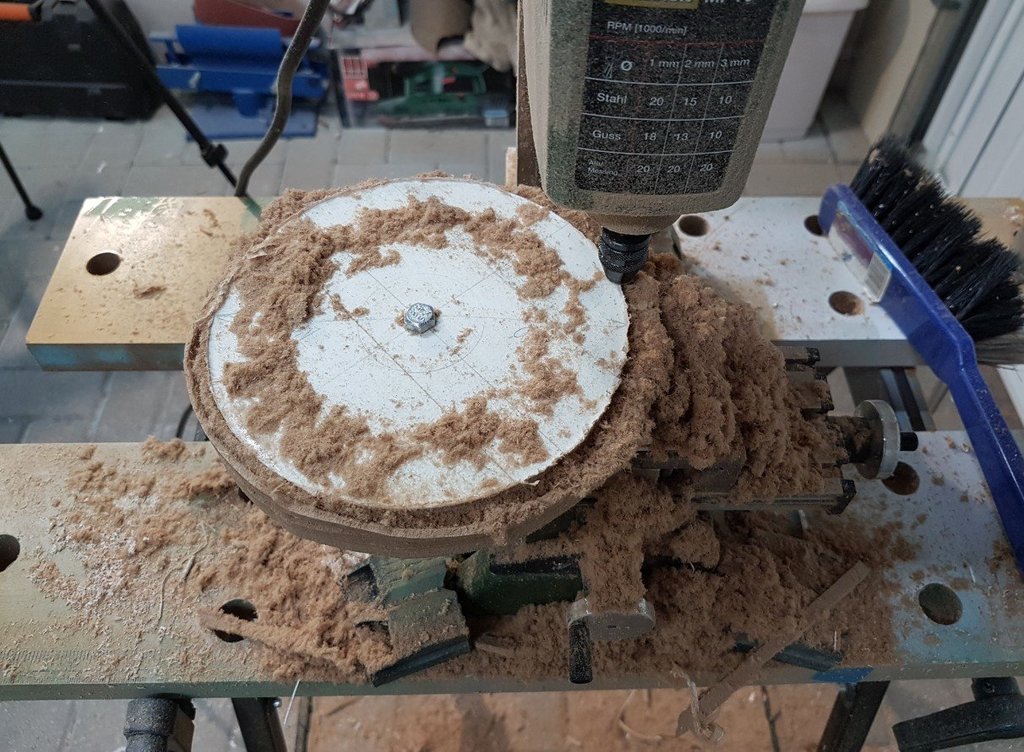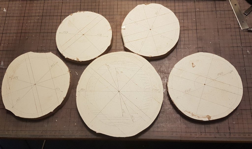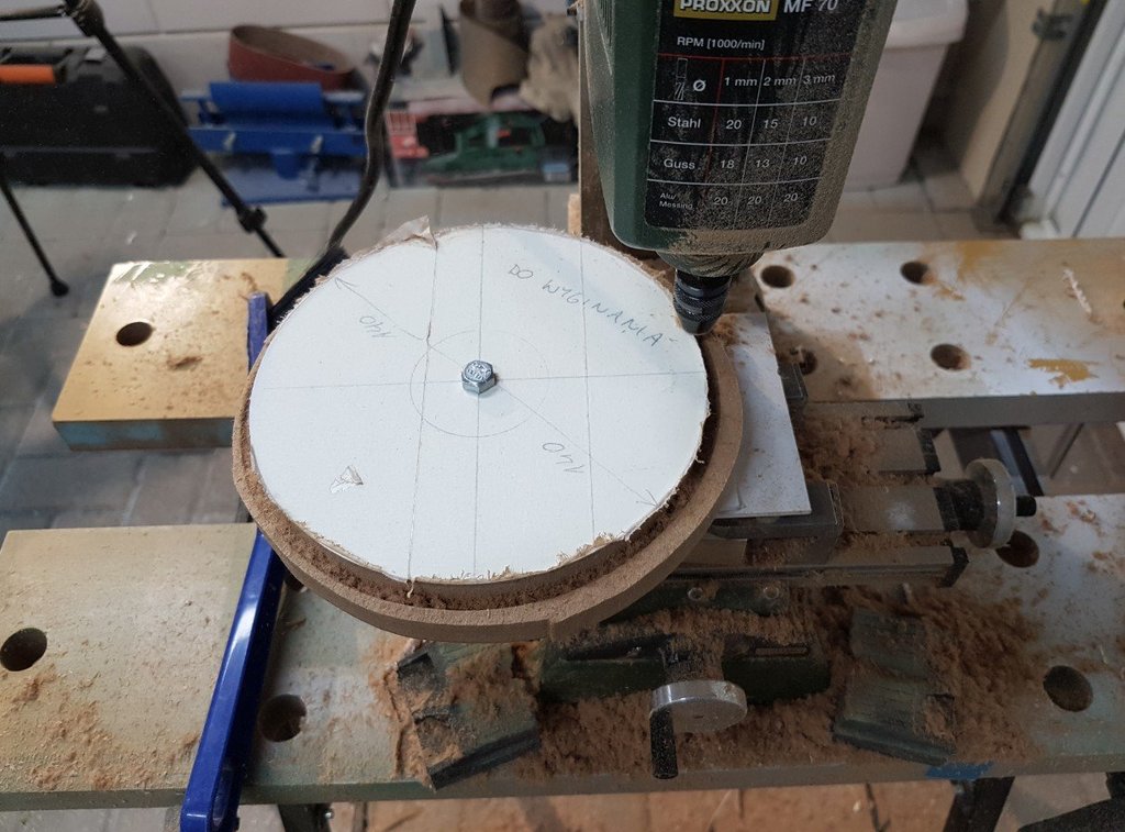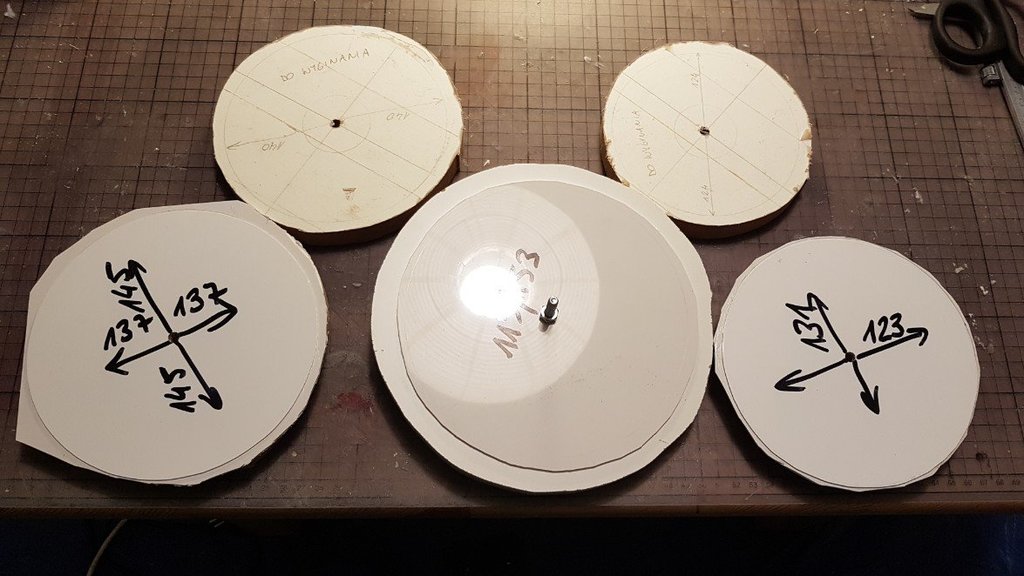 Ostatnie dni to przygotowania do wykonania obrotnicy haka. Najpierw natrasowałem koła na płycie HDF i zgrubnie wyciąłem. Posłużą jako szablony do wyginania i wycinania.... za pomocą taśmy dwustronnej przykleiłem płytę ABS. Po wycięciu będzie łatwo oderwać, a jednocześnie zapewnia dobre mocowanie.... przygotowanie frezarki do wycinania. Musiałem zrobić podporę, gdyż ze względu na dużą średnicę koła falowały podczas obracania... pierścień górny zewnętrzny ślizgu wycięty..... moment wycinania szablonu do wyginania pierścieni podporowych..... wszystkie elementy wycięte..... koła zewnętrzne posłużą do wyginania pionowych elementów obrotnicy..... -