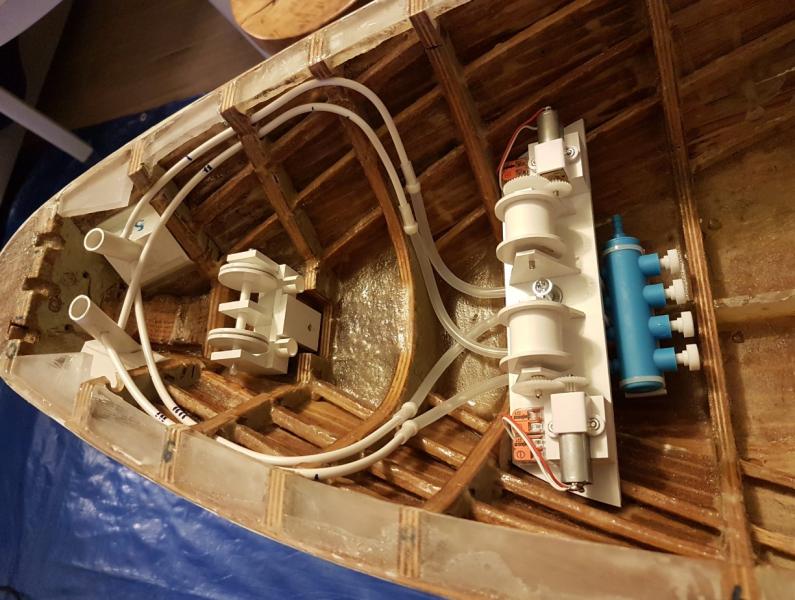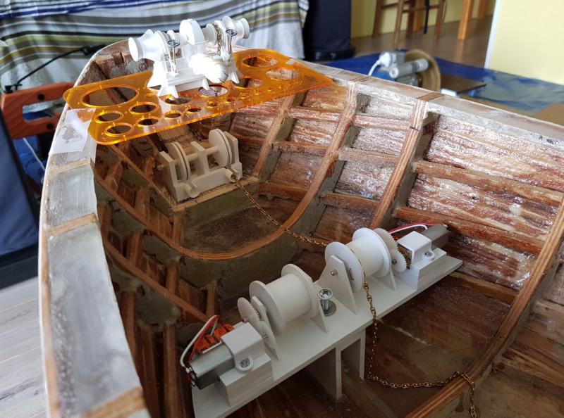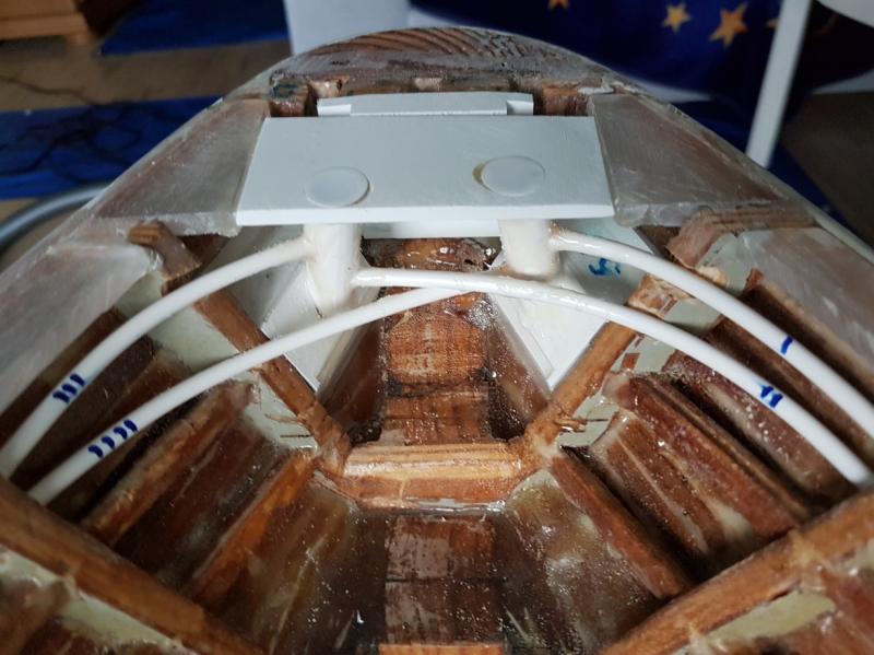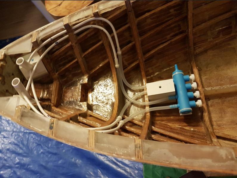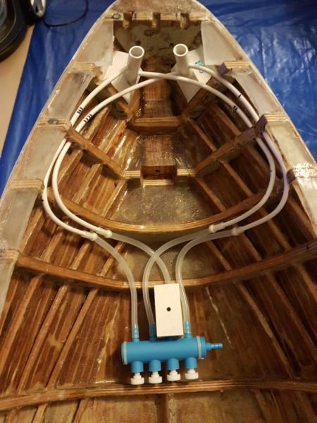 I już wnęki na gotowo: próba wciągania kotwicy do kluzy. W końcu kotwica się samoczynnie układa tak jak powinna: przymiarka do systemu "woda na kotwicę" główne linie, które będą w miejscu niedostępnym po nałożeniu pokładu będą na rurkach PVC. Dopiero do niech w miejscu dostępnym będą podłączone wężyki silikonowe. -