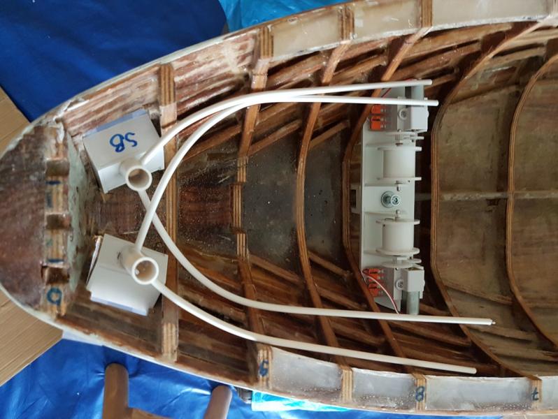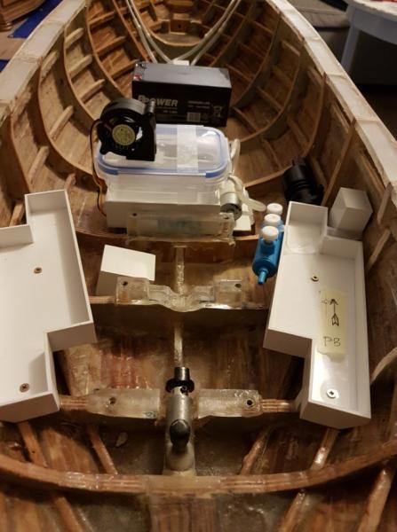Próby wodne pokażą jak będzie. Waga czterech baterii LiPo to 1,55 kg, a silnika z przekładnią 0,8 kg. Do ostatecznego wyważenia według moich kalkulacji będzie potrzebne dodatkowe 5-7 kg ołowiu, który będzie rozmieszczony tak jak napisałeś przy stępce. Baterie musiałem, tak umieścić, aby mieć dostęp i miejsce na pozostałe elementy wyposażenia, a będzie ich jeszcze sporo. Do ich zasilenia będzie użyty akumulator 3.4Ah 12V o wadze 2 kg, który będzie w przegrodzie bliżej dziobu. -