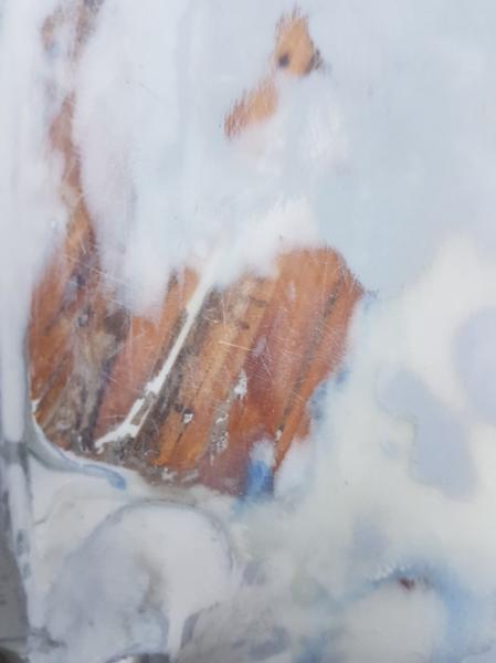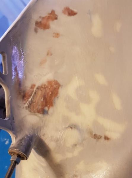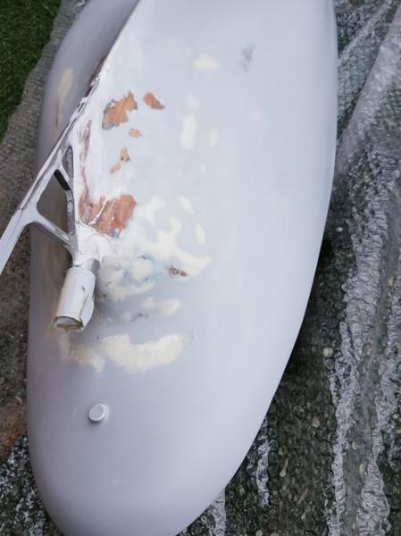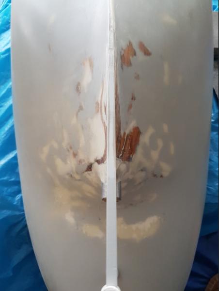A wydawało się, że jest tak równo . Podkład matowy jest bardzo złudny i mocno ukrywa małe nierówności, aczkolwiek daje ładny efekt. Po przeszlifowaniu wszystkie wady się uwidoczniły. Ale teraz to już tylko walka z grubością farby i znowu szpachla i szlifowanie. Żywica ładnie wsiąknęła w odkryte drewno. po przymiarce musiałem skorygować położenie rolek pośrednich łańcucha kotwicznego, tak, aby linia łańcucha ładnie przebiegała pomiędzy punktami zmiany kierunku. Zamontowane także tak, aby był dostęp po nałożeniu pokładu i ewentualny demontaż. -