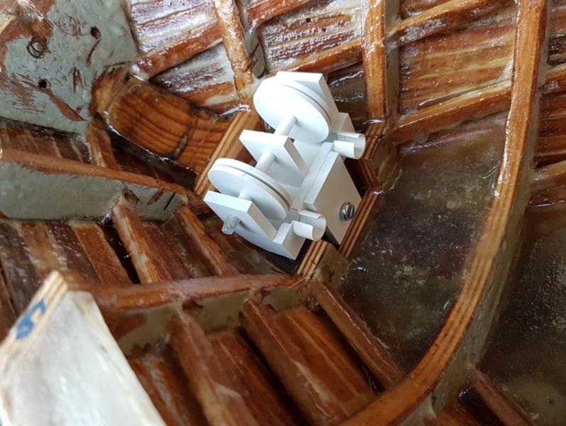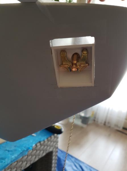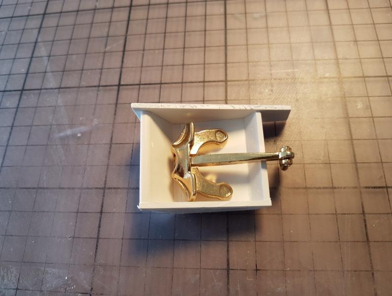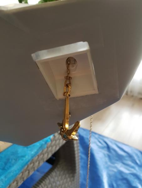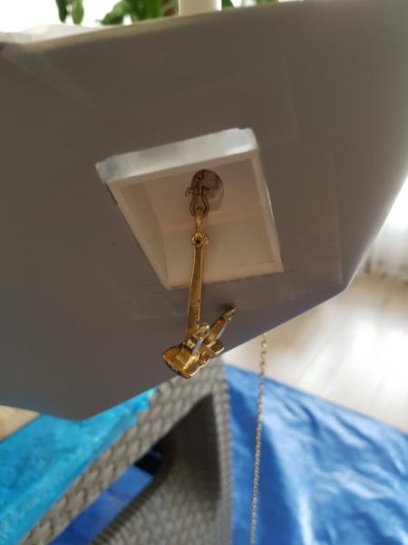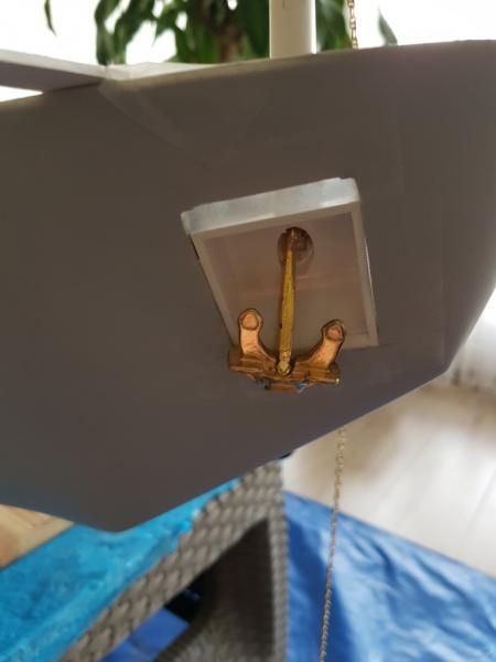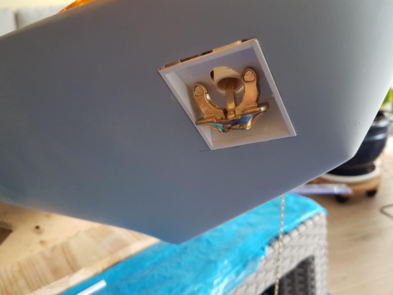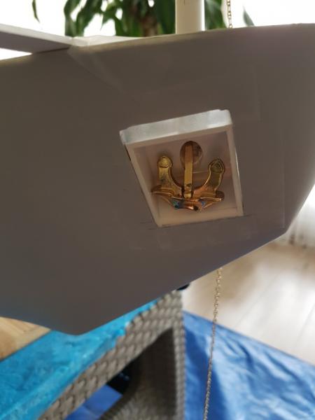 Zabrałem się za wykonanie wnęk na kotwice. Sztuka wydawała się prosta. do tego momentu szło według planu. Po przymiarce na statku... razem z łańcuchem i po uwzględnieniu miejsca, gdzie łańcuch ma wychodzić na pokładzie okazało się, że nic nie pasuje. Kotwica się źle układa, nie dolega do płaszczyzny, łańcuch idzie pod złym kątem i do tego całość z szaklami jest za długa. Ogólnie buba. W końcu po paru godzinach prób zrobiłem model wnęki spełniający te wymagania. Niby taki sam, ale wszystkie kąty inne. Błędem było, że robiłem wg planów, a tu trzeba było dopasować statek do kotwicy Dodatkowo musiałem obniżyć miejsce wnęk na kadłubie.... a i tak okazało się, że jeszcze muszę obniżyć, aż do linii narysowanej ołówkiem. Jednym słowem dół wnęki dojdzie prawie do linii wodnej. W zasadzie tak powinno być. -