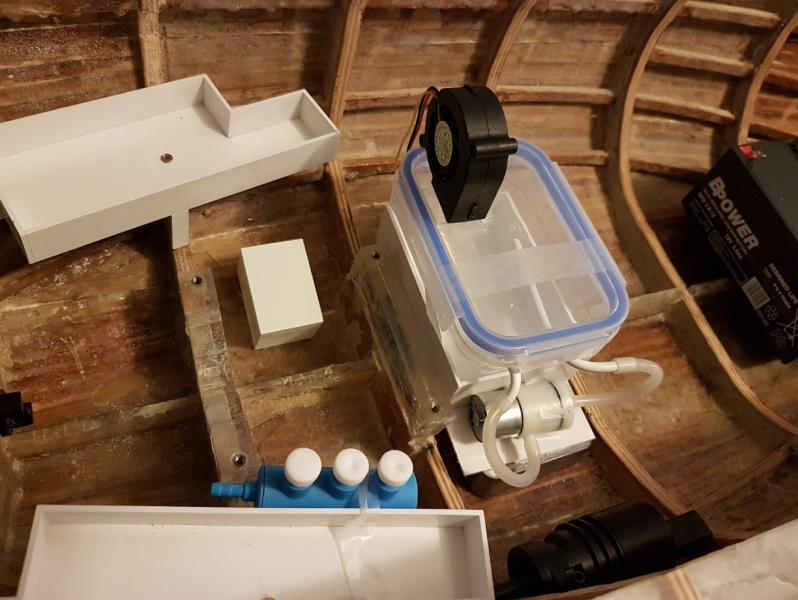 Dzięki Andrzeju :). W końcu skompletowałem wszystkie elementy, więc czas na budowę wytwornicy dymu. Wieka niewiadoma co z tego wyjdzie, bo robię to pierwszy raz. Ale wierzę, że powinno dobrze dymić. Elementy wykorzystane do tej pory: pudełko śniadaniowe pompka samozasysająca, przeponowa, 1.5 l/min, 12V spirala grzejna od suszarki. Z niej wezmę tyle, aby dobrze grzało. Wg prób wychodzi, że jakieś 20-30 mm po podłączeniu do 12V dmuchawa promieniowa 12V, bezszczotkowa I całość po zmontowaniu i włożeniu na miejsce oj ciasno się robi. A gdzie do końca ? dojdzie jeszcze silnik z układem regulującym przepływ dymu, ale to następnym razem. Wieczory są za krótkie -