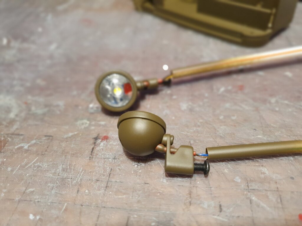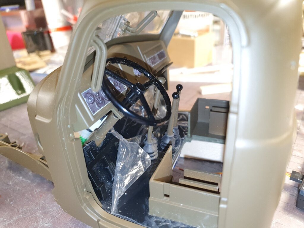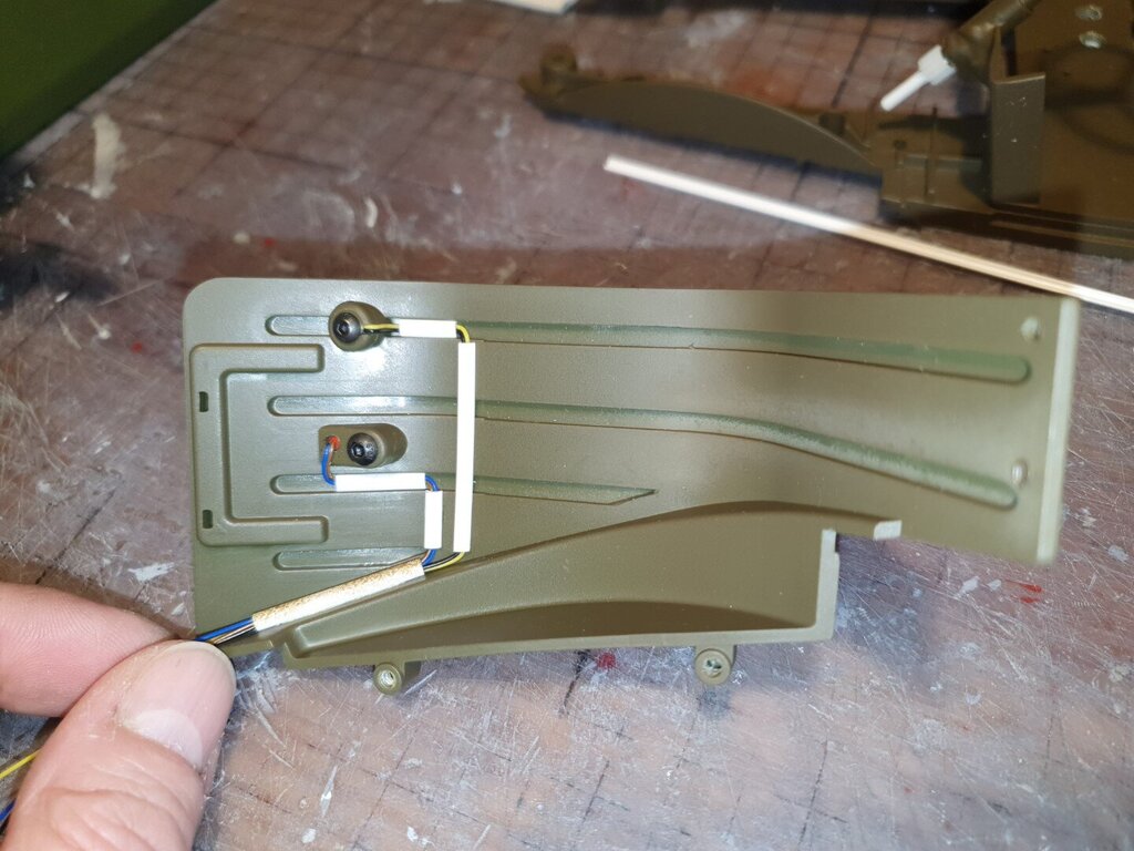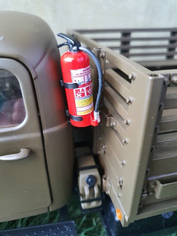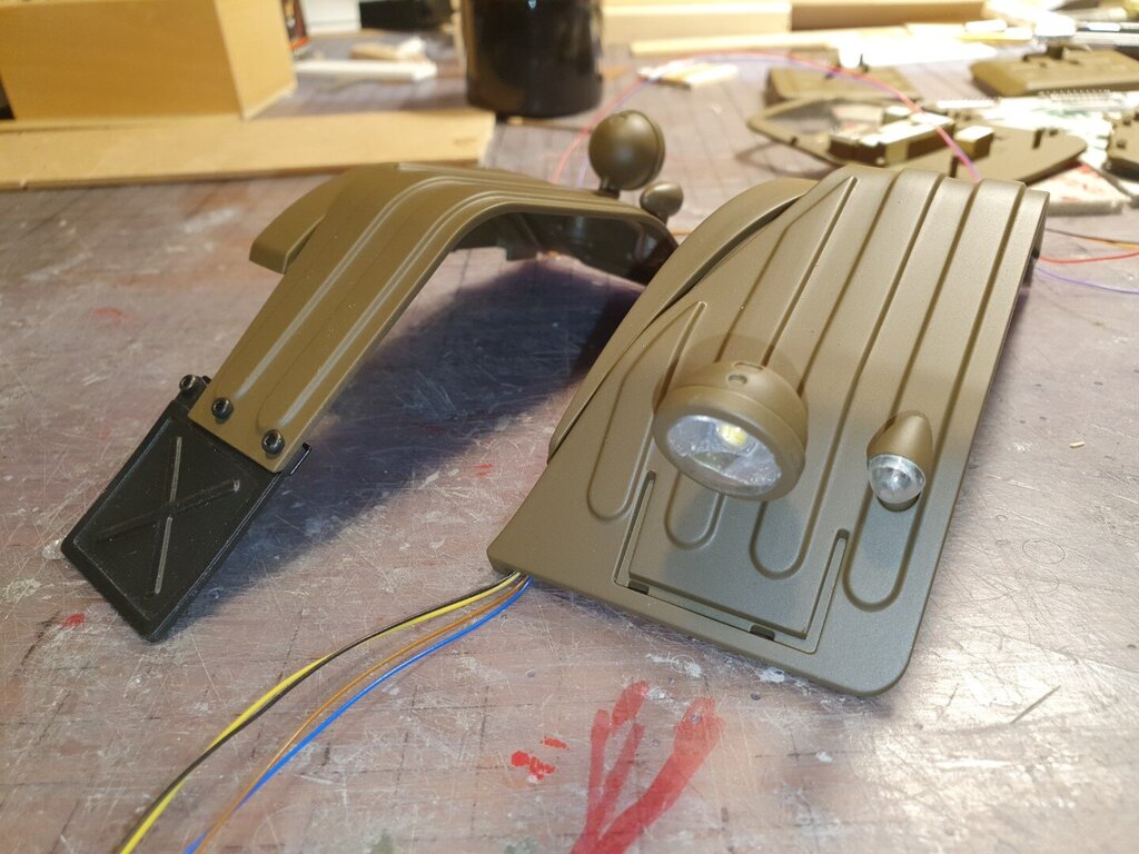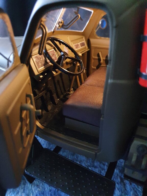 Moduł dźwięku znalazł miejsce w zbiorniku paliwa.... wszystkie elementy na swoim miejscu.... lina na bębnie wciągarki.... dołożona gaśnica.... tylnia klapa i skrzynia z ławkami... oświetlenie kabiny.... jeszcze są światła tylnie... -