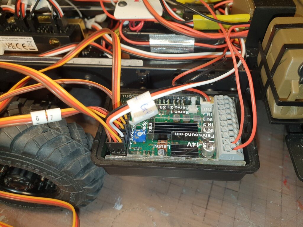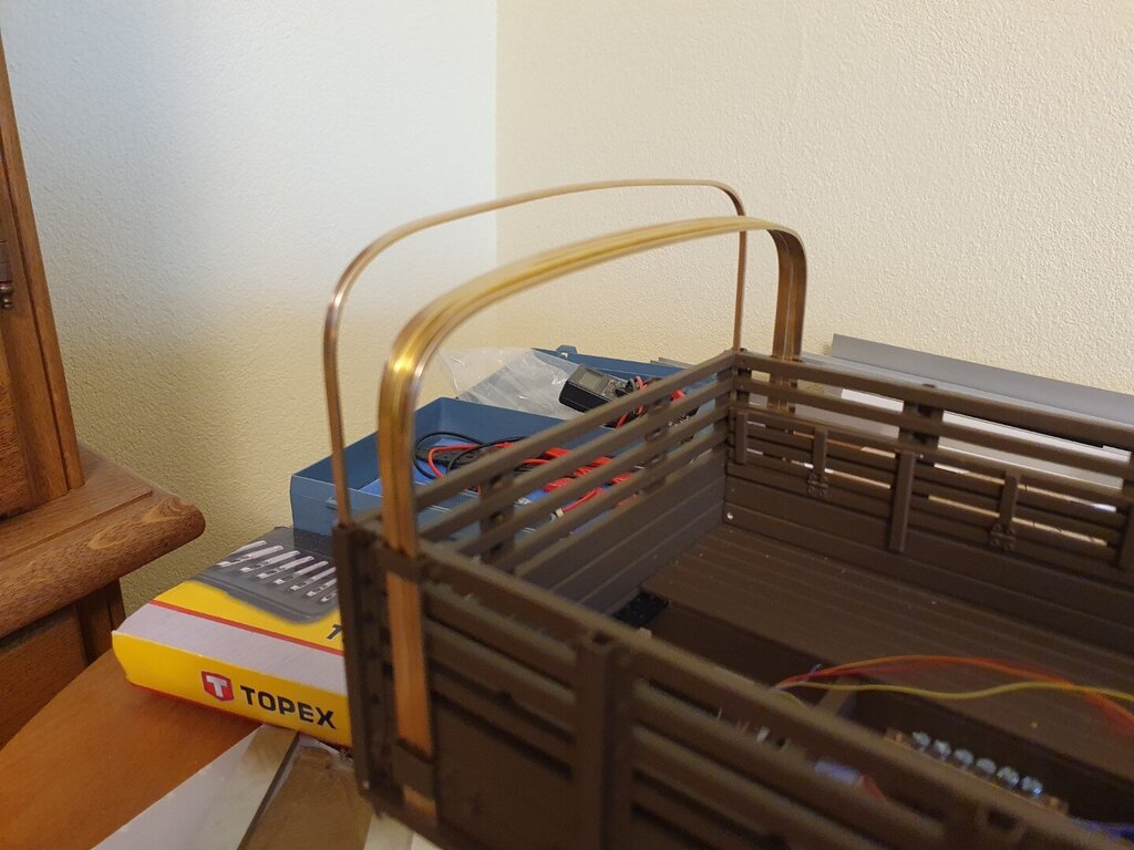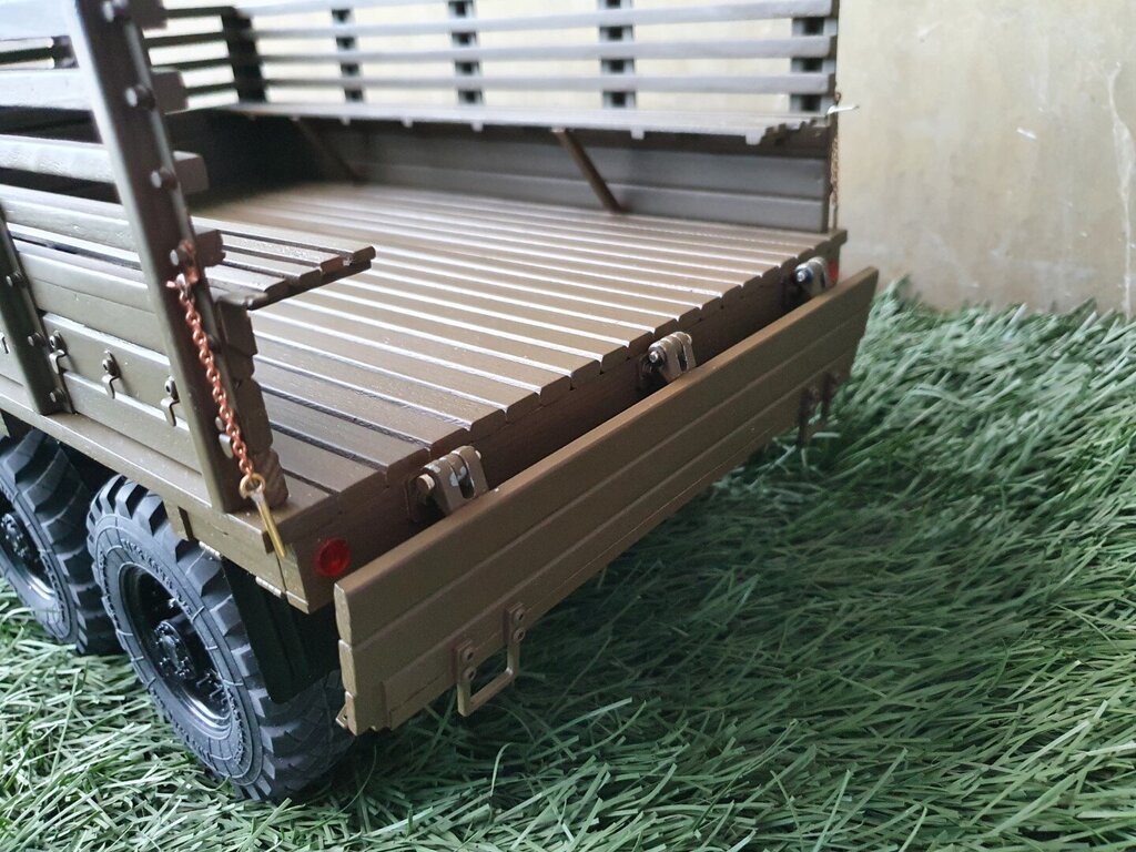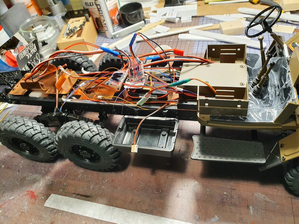 W trakcie testów modułu zdalnego świateł do przyczepy. Wg instrukcji zasięg sygnału to 5 metrów. Więc bardzo daleki. Nadajnik z odbiornikiem nie muszą się widzieć. Jedynie światła stopu nie działają właściwie. Widać jakaś wad układa. Ale w przyczepie rozwiążę to za pomocą styczników... i wszystko zamontowane w modelu.... wszystko zmieściło się pod podłogą w skrzyni. -