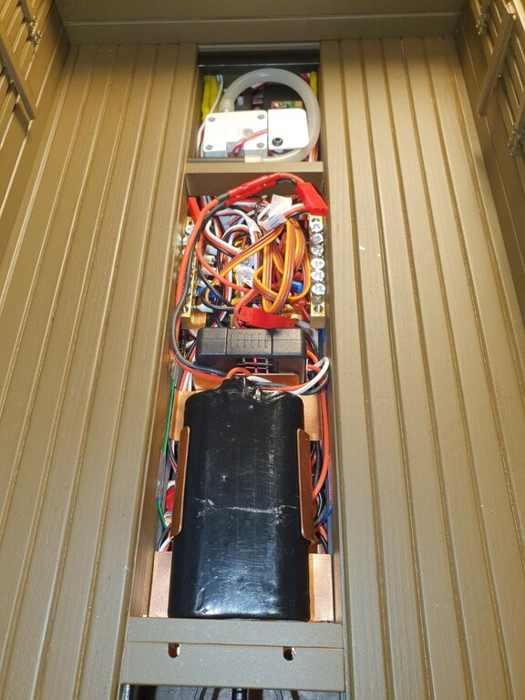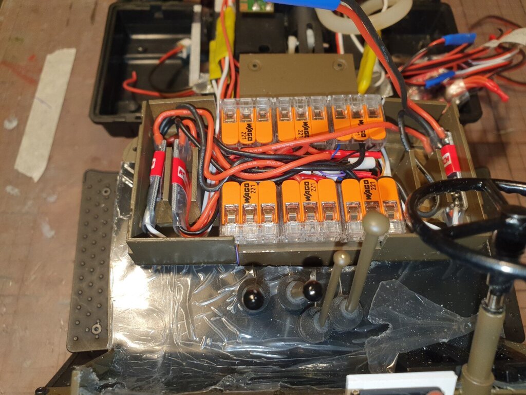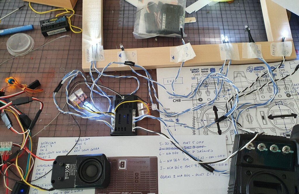 W trakcie podłączania obwodów. Jest bardzo ciasno. widoczne ESC dla wytwornicy dymu i wciągarki.... tu włączniki dla świateł przednich i kabiny.... -