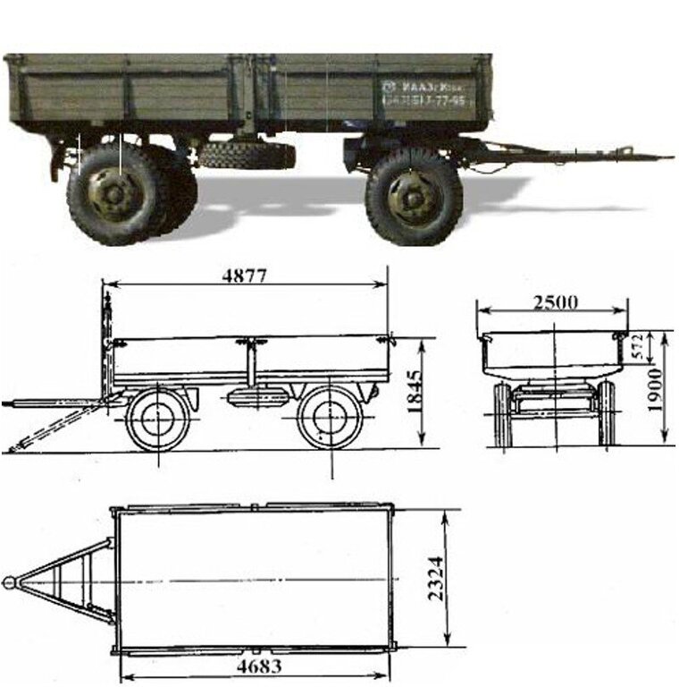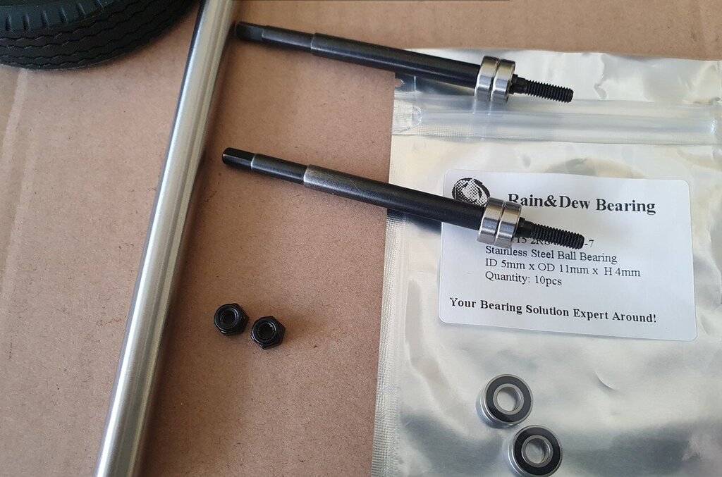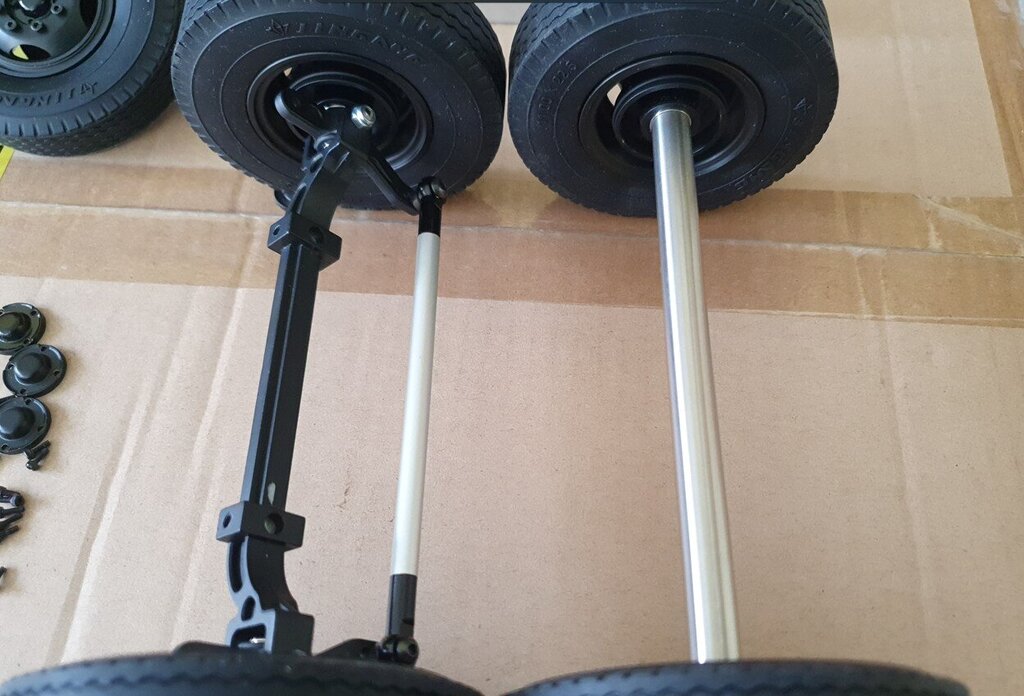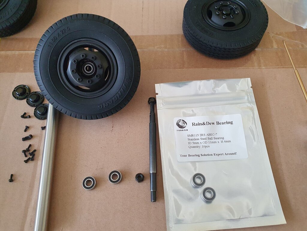 Ciągnik prawie skończony więc przyszedł czas, aby zrobić przyczepę. Przyczep gotowych dla tej skali i tego typu nie ma. Będę korzystał z elementów dostępnych. Resztę będzie trzeba wykonać od zera. Przyczepa do ZIŁ-157 jest bardzo specyficzna, gdyż nie ma wózka obrotowego ze skrętną belką. Zamiast tego ma koła skrętne. Bazuje na podzespołach ciągnika, stąd wyszła taka skomplikowana konstrukcja. Nie mam wystarczających planów, rysunków, ani nawet zdjęć. Może ktoś czytający forum coś posiada? Inaczej będę musiał improwizować. A tak to wygląda... Póki co planuję złożyć osie. Z przedniej wykorzystam osie i trzpienie obrotowe od jakiejś ciężarówki. Łożyska 5x11x4 po 2 na koło. Belka będzie wymieniona na prostą. Tylna belka wykonana z rurki stalowej 10 mm. Do środka włożyłem osie firmy CROSS oraz piasty od KKRC. Trzeba uważać, bo takie same piasty mogą też być też napędowe i wtedy mają w środku sześciokąt. Łożyska 4x11x5, 2 sztuki na koło. Długość belki to 140 mm Wtedy rozstaw kół jest taki sam jak w ZIŁ-157. Wymiary przyczepy będą takie. Rysunki są jednak dla innego typu....