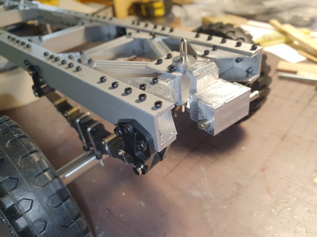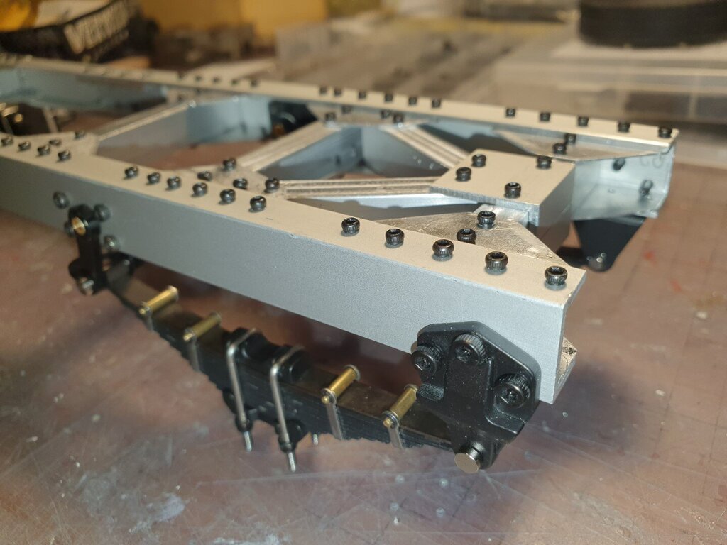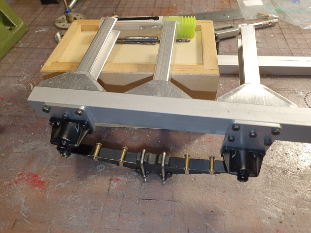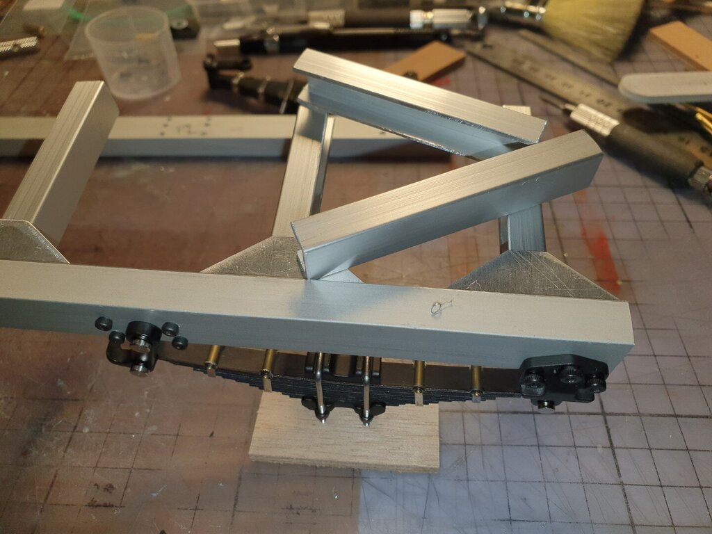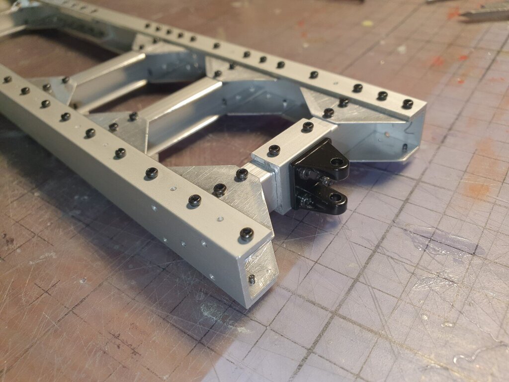 Na podłużnice ramy użyłem kształtownik C 16x12x1.5. Zmniejszyłem go na 16x10x1.5 Elementy poprzeczne ramy zrobiłem z profilu C 12x10x1.5. Zmniejszyłem na 11.7x8x1.5. Wzmocnienia krzyżowe z blachy aluminiowej grubości 0.5 mm. Resory i mocowania wykorzystałem od CA10 ZIł-151 producenta KKRC. Do połączeń śrubki M2 i M2.5. Poprzecznice są na razie przymierzone. Trzeba będzie się przyjrzeć zdjęciom przyczepy, gdzie są ich właściwe miejsca. -