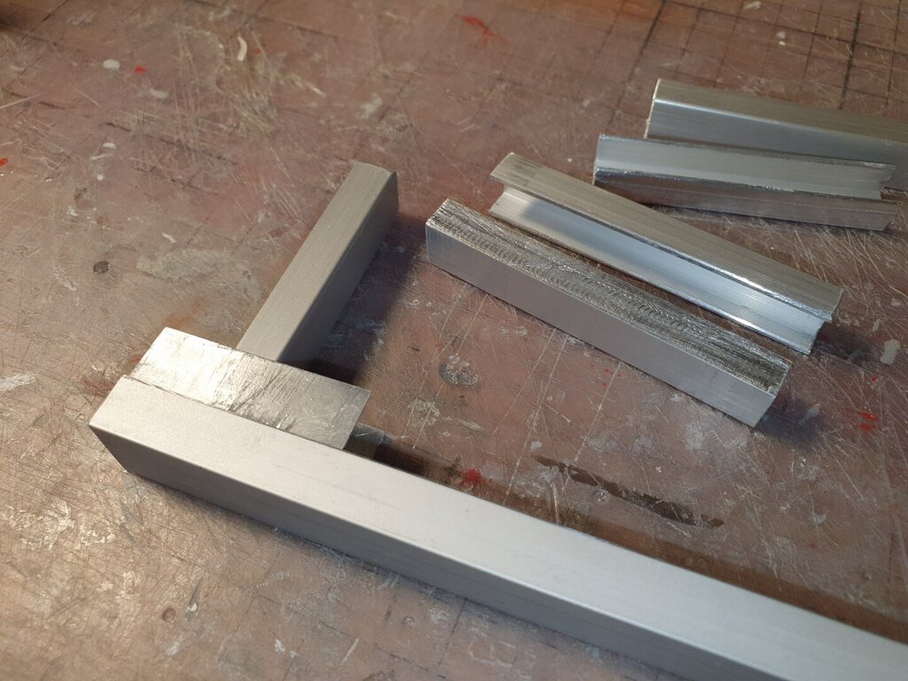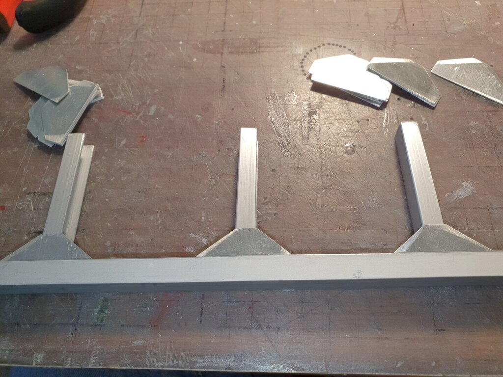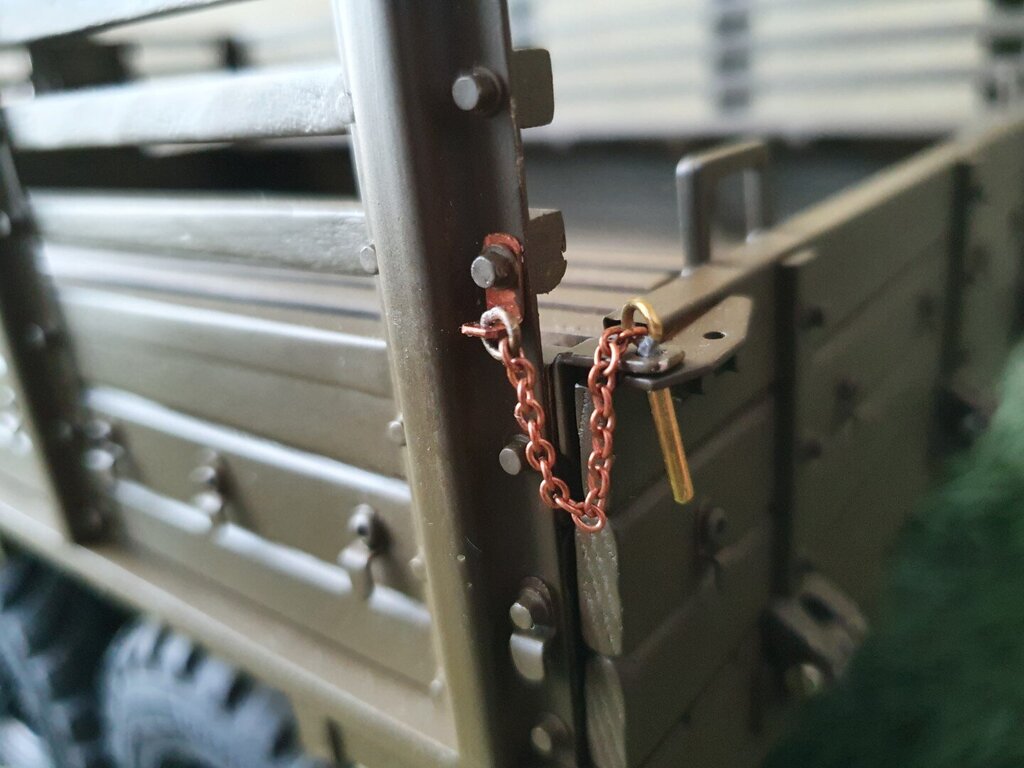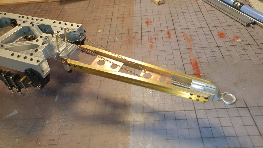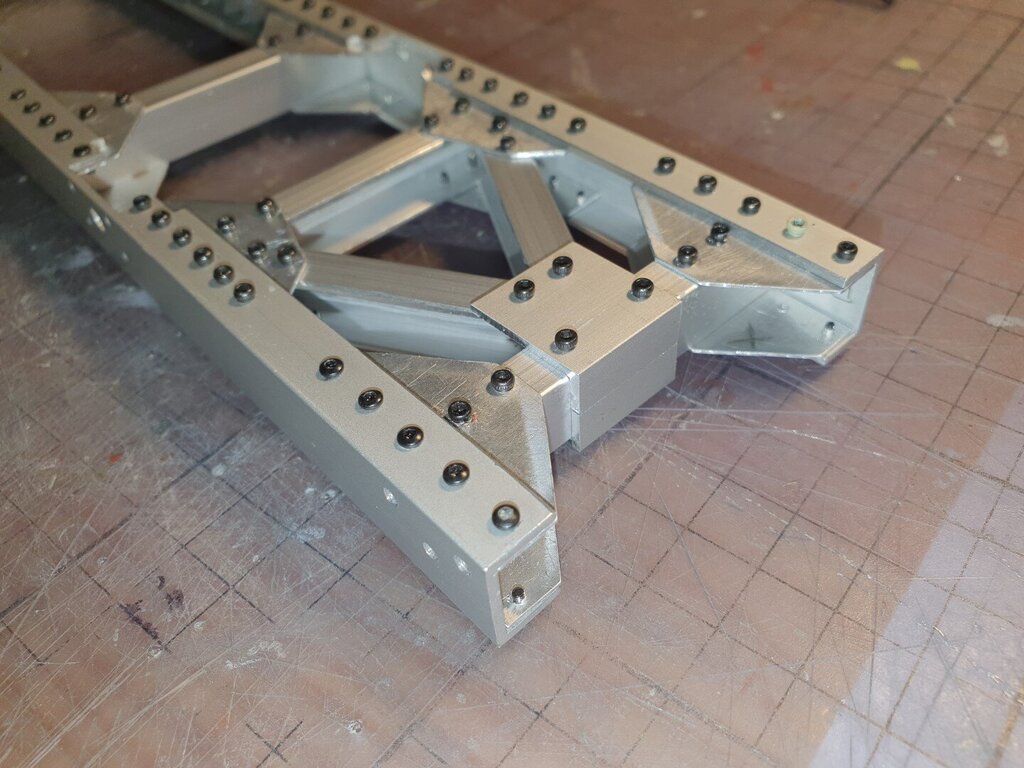 Na podłużnice ramy użyłem kształtownik C 16x12x1.5. Zmniejszyłem go na 16x10x1.5 Elementy poprzeczne ramy zrobiłem z profilu C 12x10x1.5. Zmniejszyłem na 11.7x8x1.5. Wzmocnienia krzyżowe z blachy aluminiowej grubości 0.5 mm. Resory i mocowania wykorzystałem od CA10 ZIł-151 producenta KKRC. Do połączeń śrubki M2 i M2.5. Poprzecznice są na razie przymierzone. Trzeba będzie się przyjrzeć zdjęciom przyczepy, gdzie są ich właściwe miejsca. -