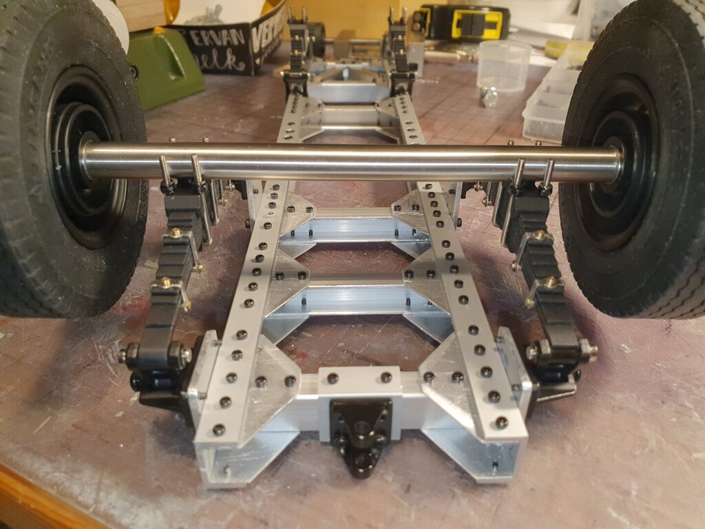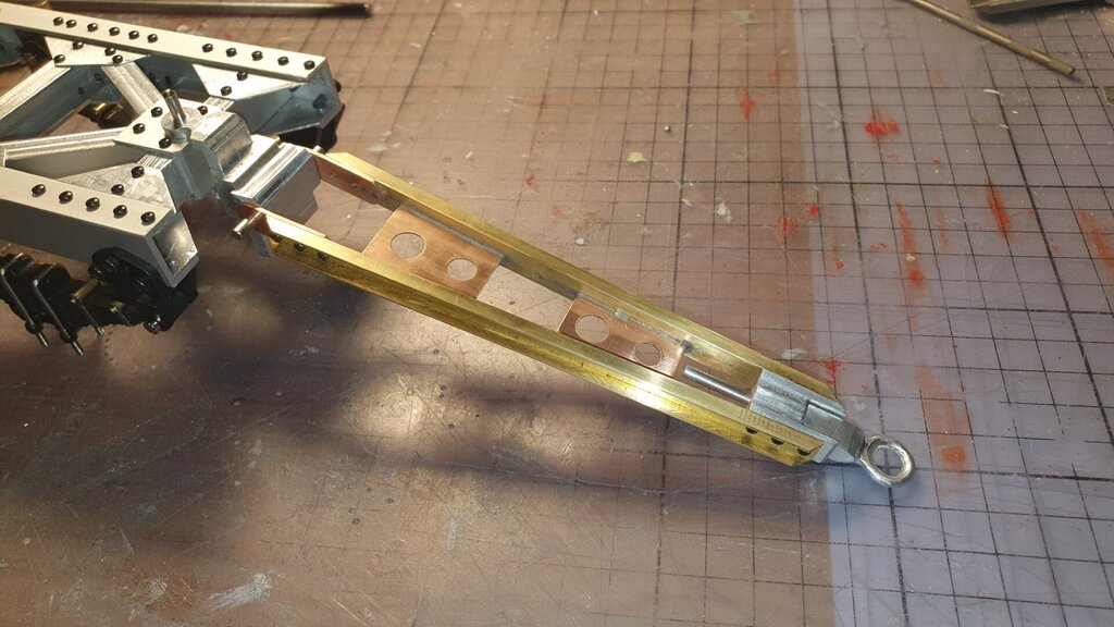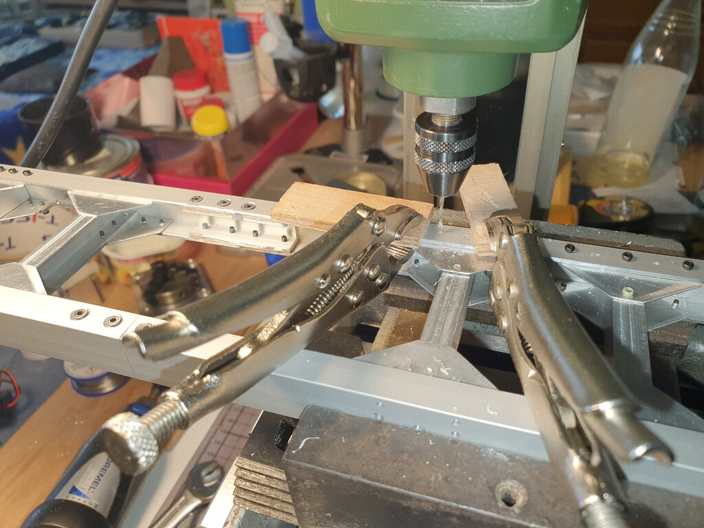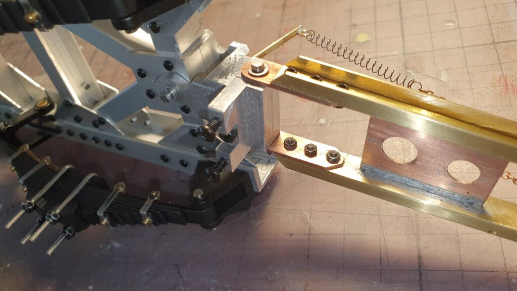 W trakcie nawiercania elementów.... zmontowana przednia część ramy przyczepy. Śrubki M1.6.... i tylna z gotowym zaczepem dla dodatkowej przyczepy.... tu z zamontowanymi resorami. Przedni ... tylni.... oś będę musiał dopasować do mocowań resorów. Wałek jest z nierdzewki, więc póki co nie bardzo czym mam go obrabiać.... przednią oś w większości będę musiał wyrzeźbić. -